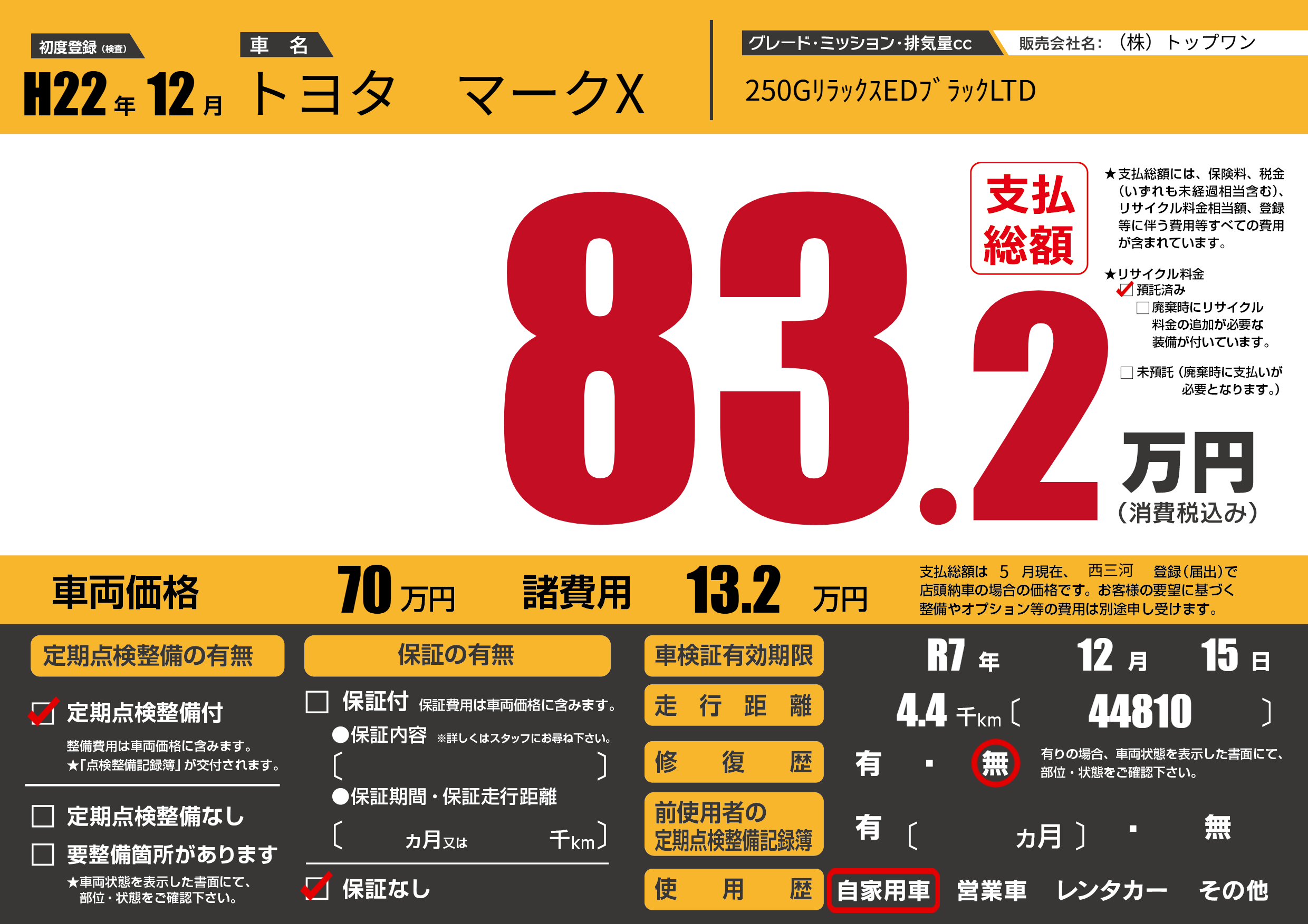 | 車名 | トヨタ マークX | グレード ミッション 排気量 |
