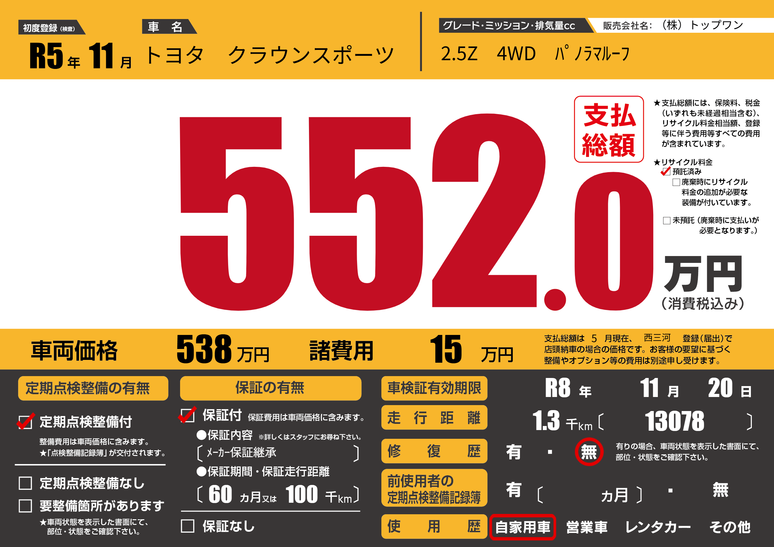 | 車名 | トヨタ クラウンスポーツ | グレード ミッション 排気量 |