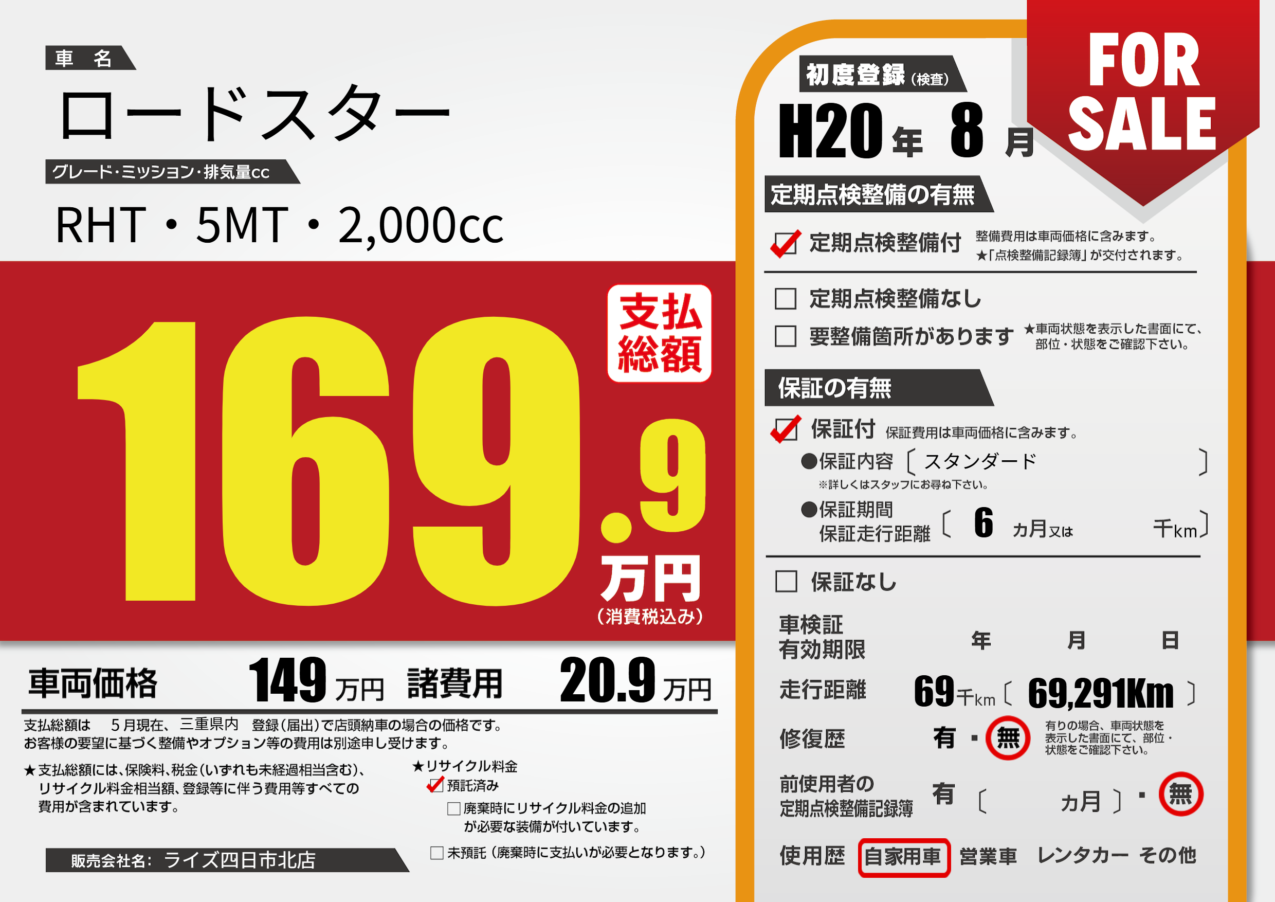 | 走行キロ | 6.9万km | 初年度登録 | H20年8月 |