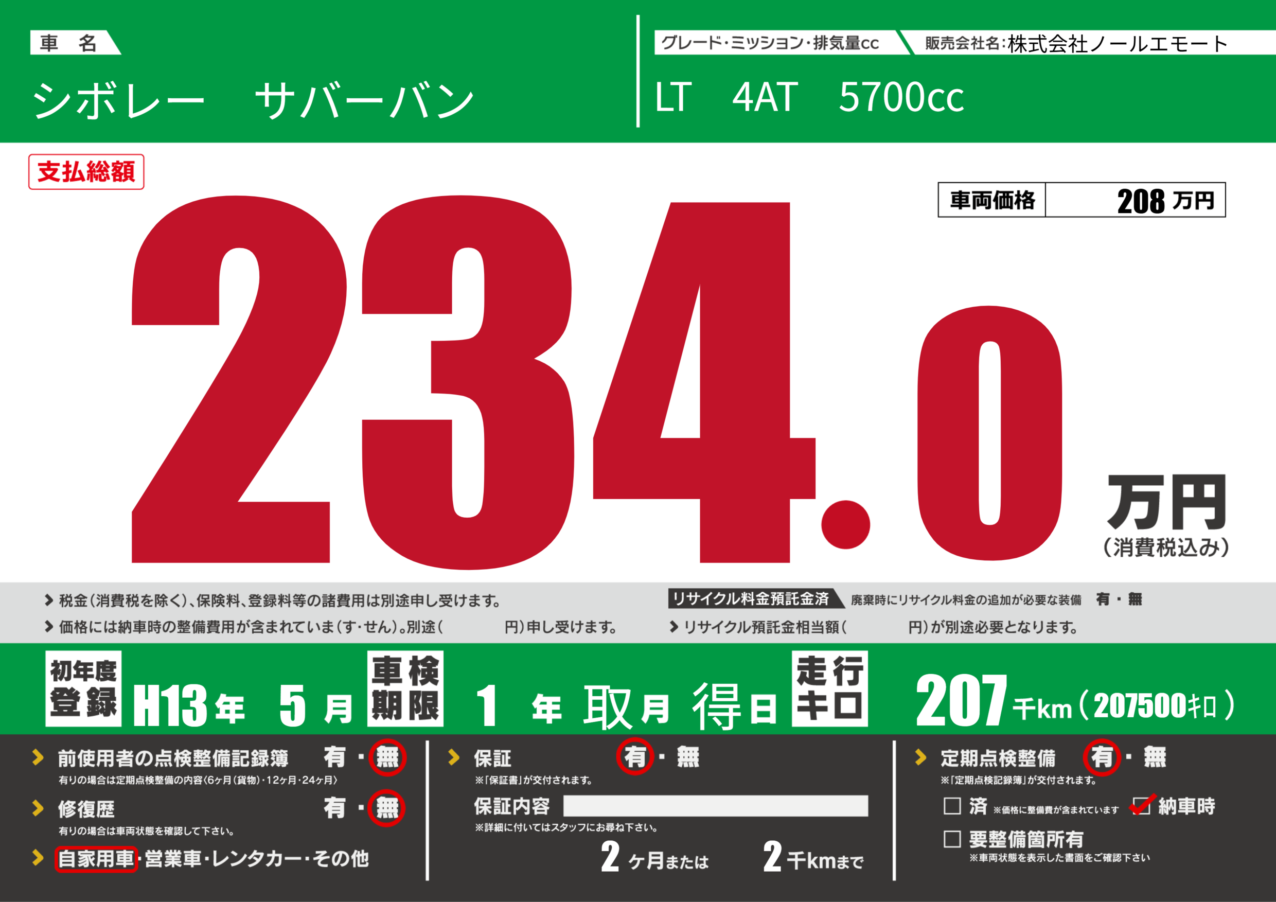 | 定期点検整備 | 定期点検整備あり 納車時あり | ||