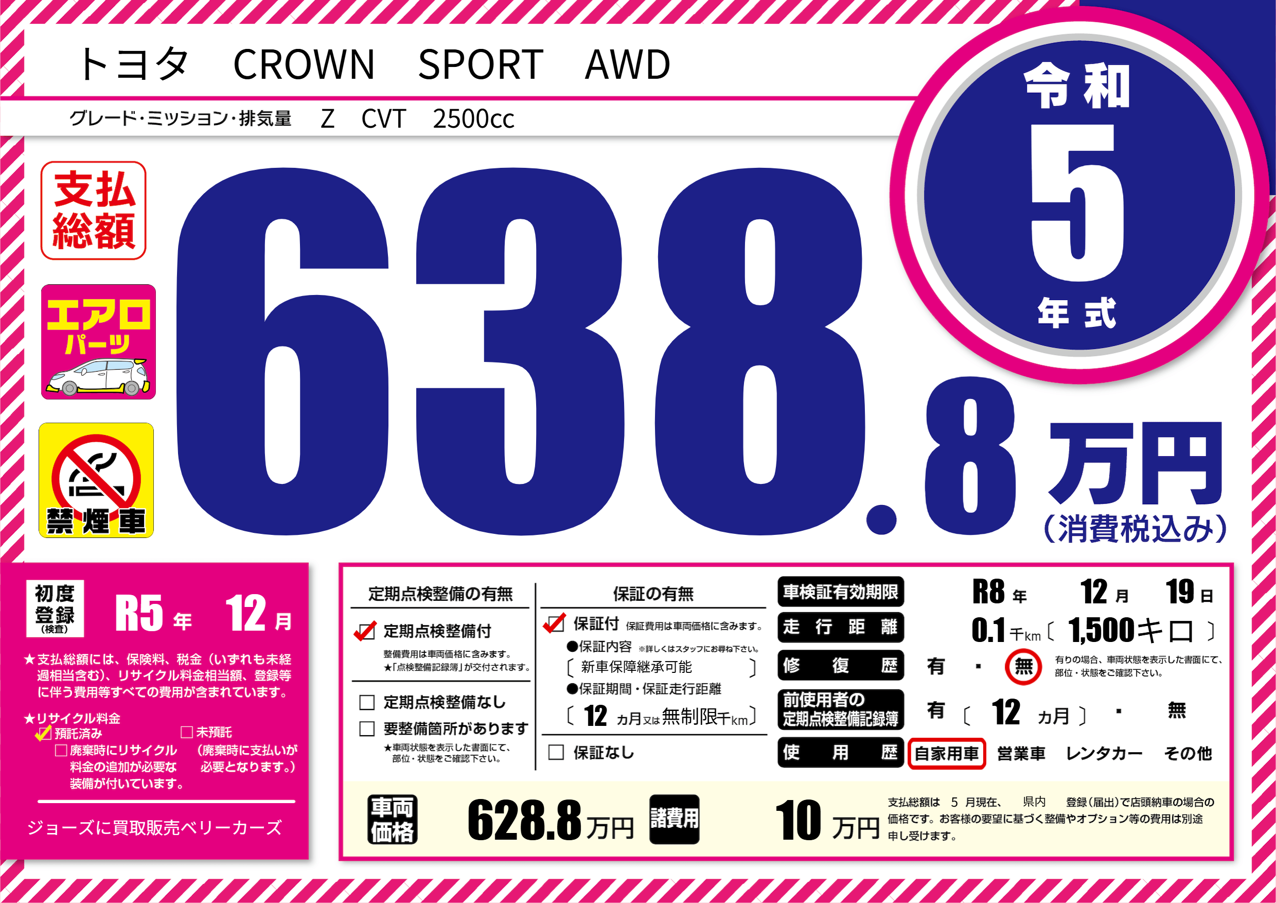 | 車名 | トヨタ CROWN SPORT AWD | グレード ミッション 排気量 |