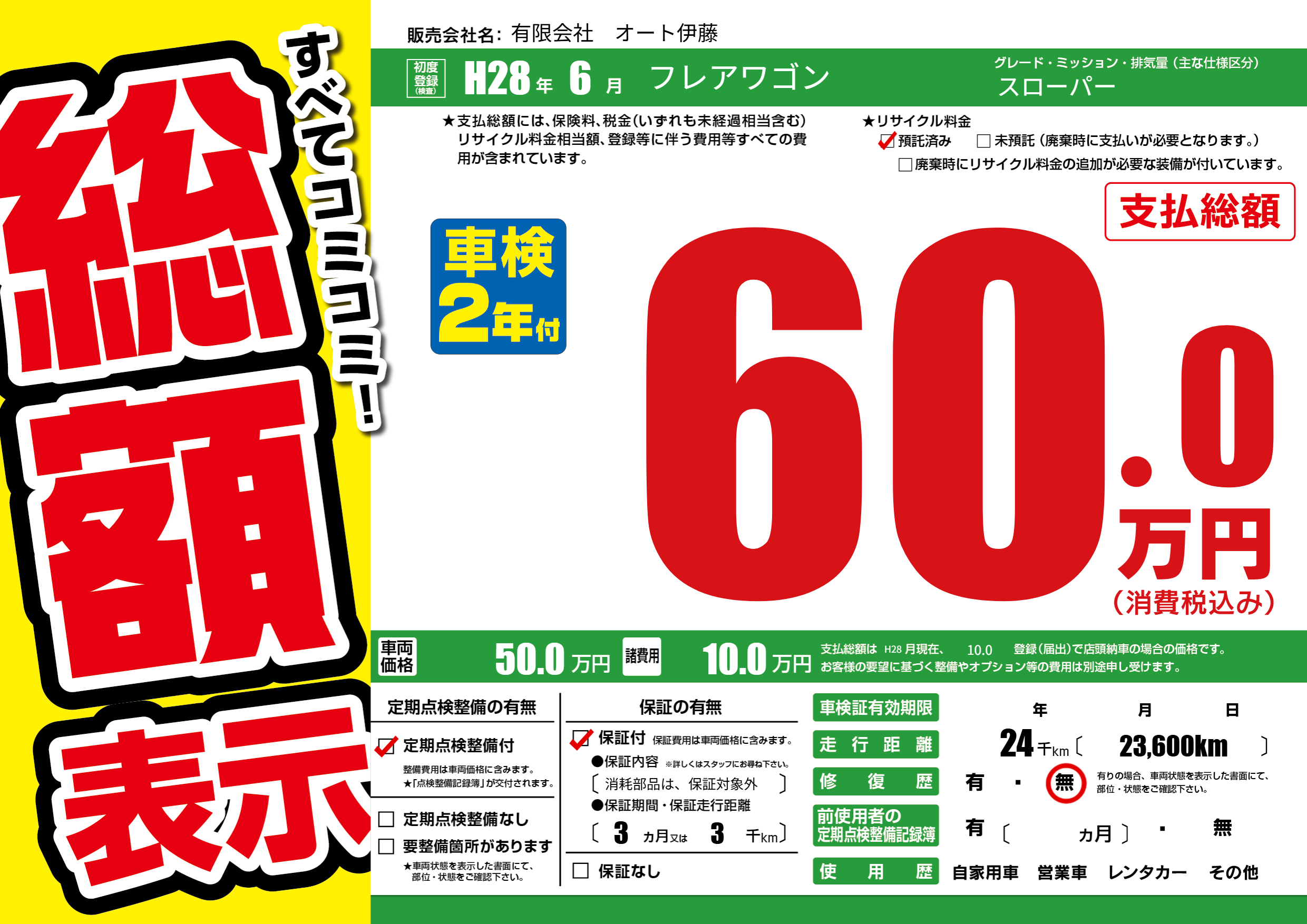 保証付き 保証内容(消耗部品は、保証対象外) 3ヶ月または3千km |