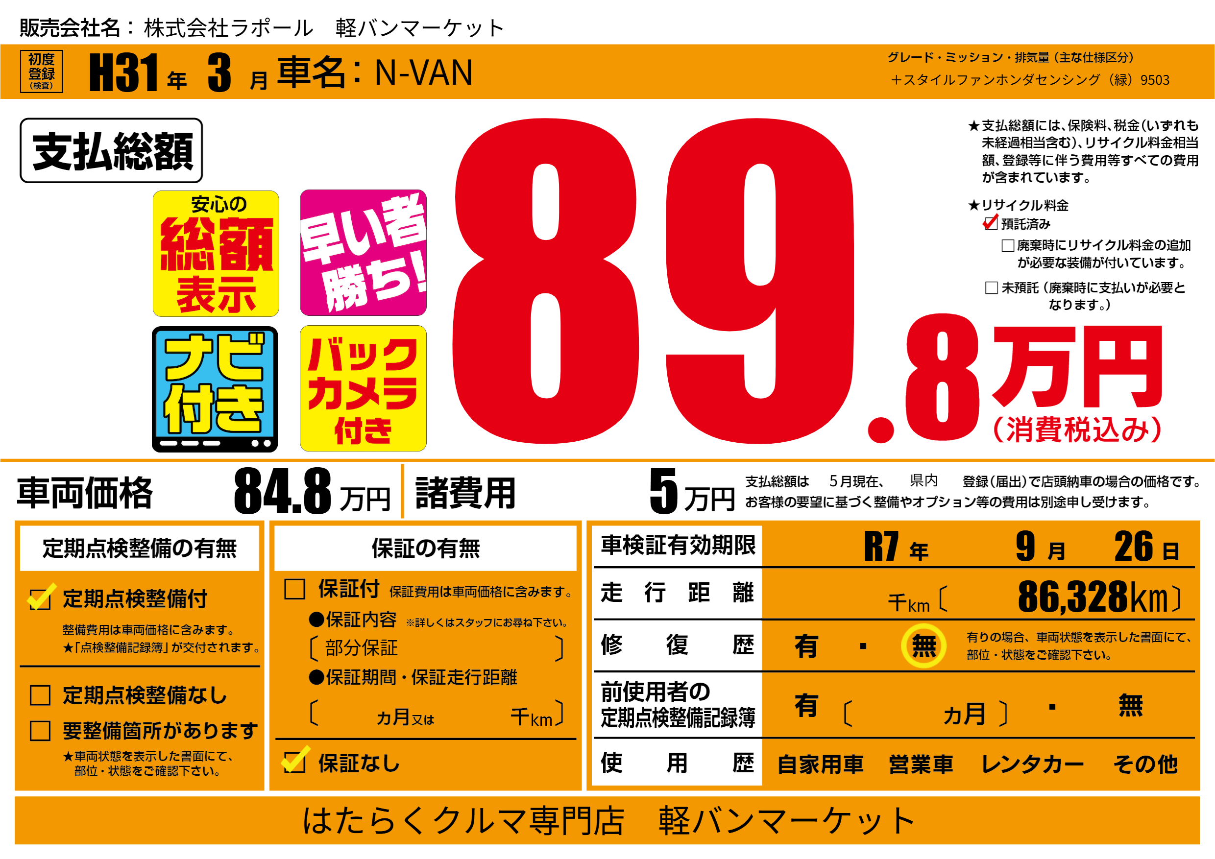 なし | 車検制限 | R7年9月26月 |