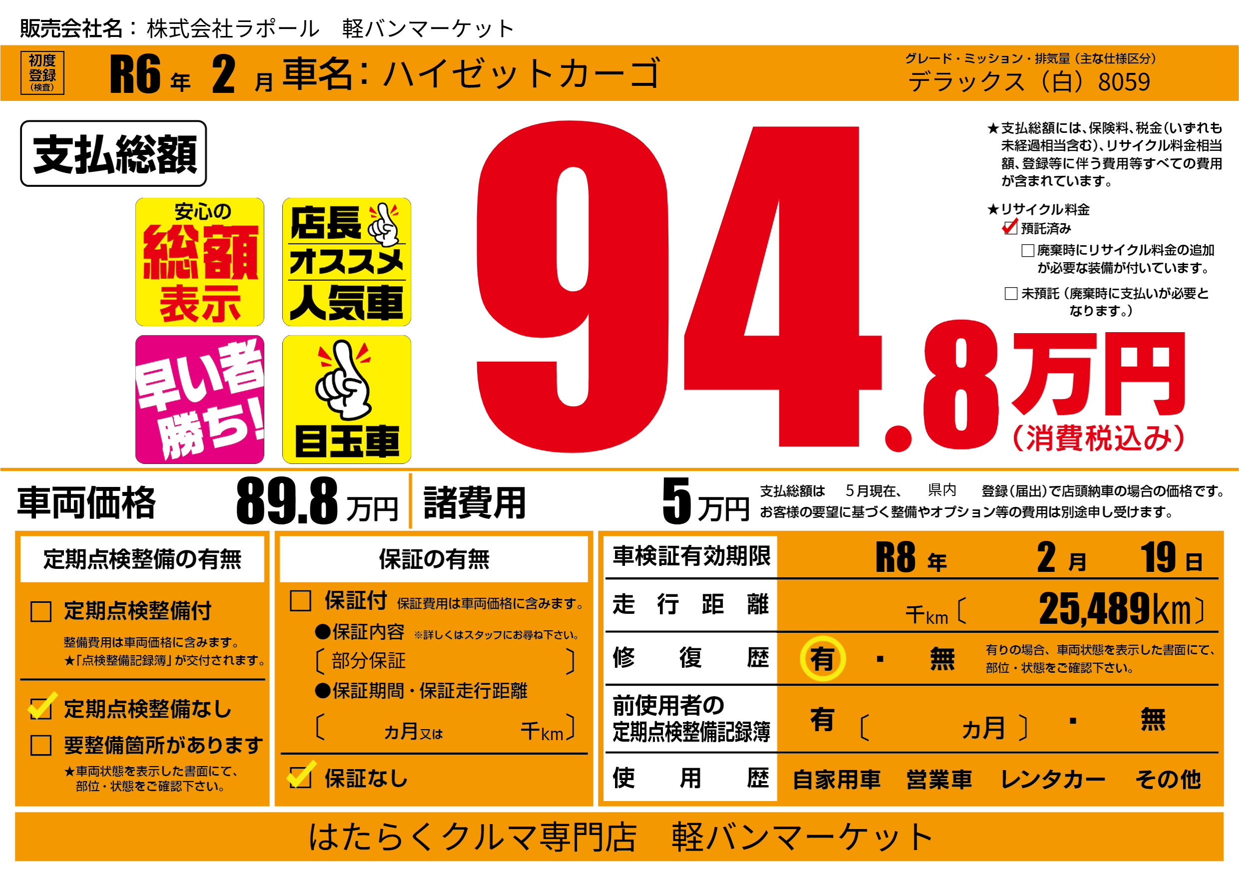 | 車名 | ハイゼットカーゴ | グレード ミッション 排気量 |