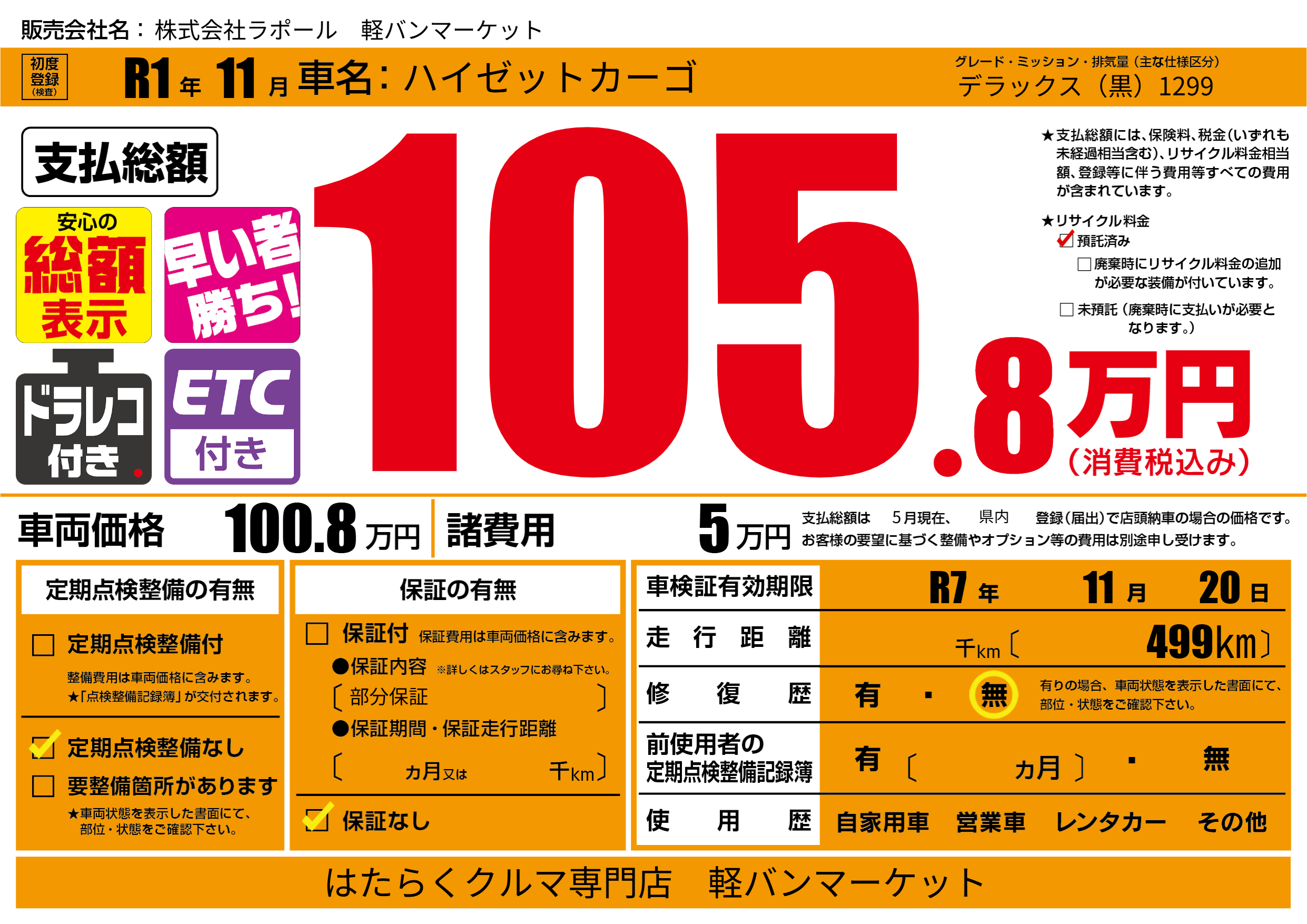 | 走行キロ | - | 初年度登録 | R1年11月 |