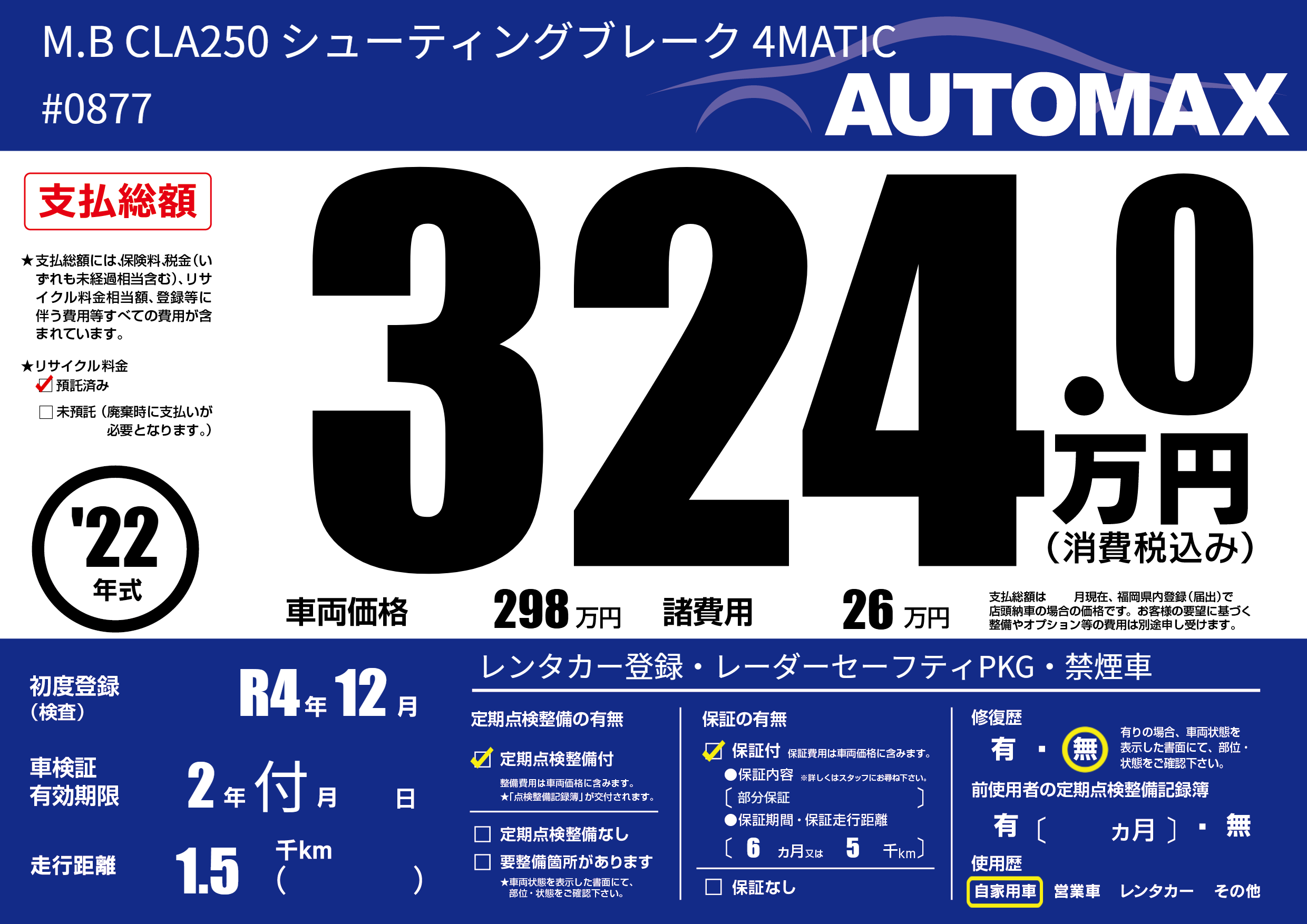 | 車名 | M.B CLA250 シューティングブレーク 4MATIC | グレード ミッション 排気量 |