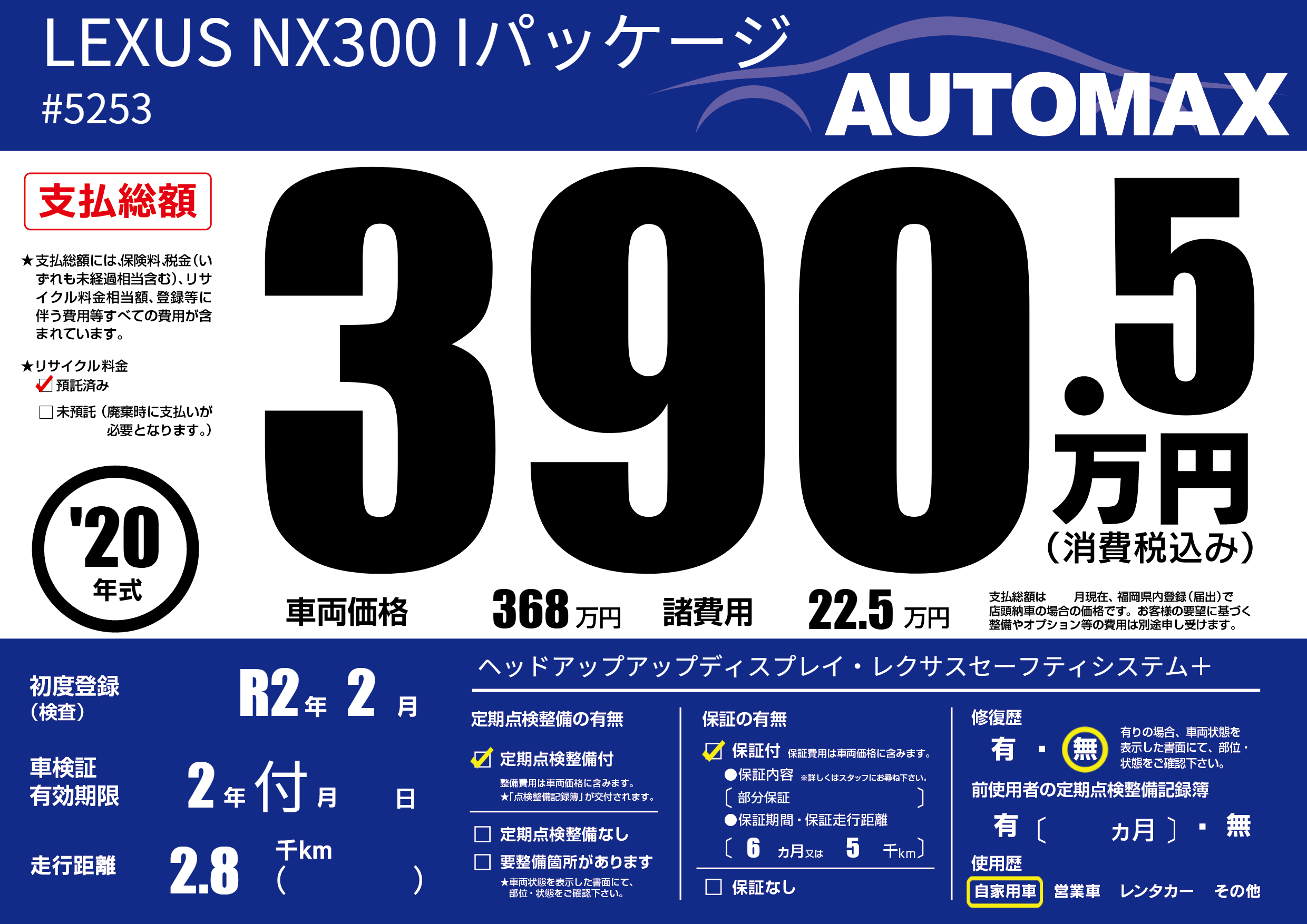 | 車名 | LEXUS NX300 Iパッケージ | グレード ミッション 排気量 |