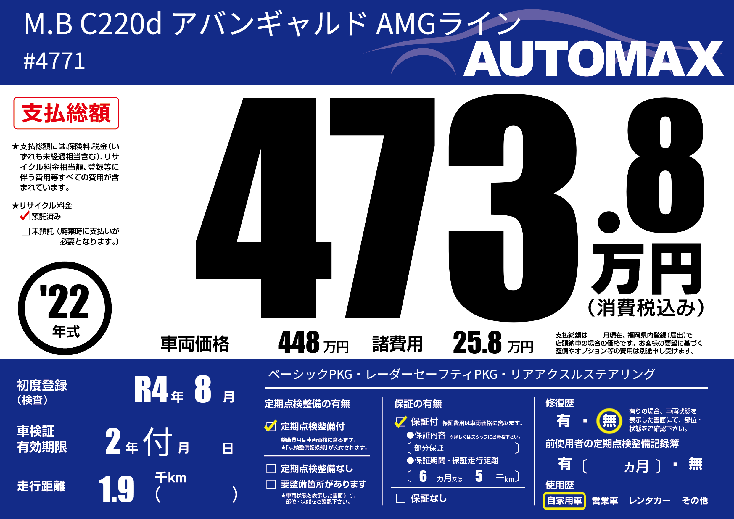| 車名 | M.B C220d アバンギャルド AMGライン | グレード ミッション 排気量 |