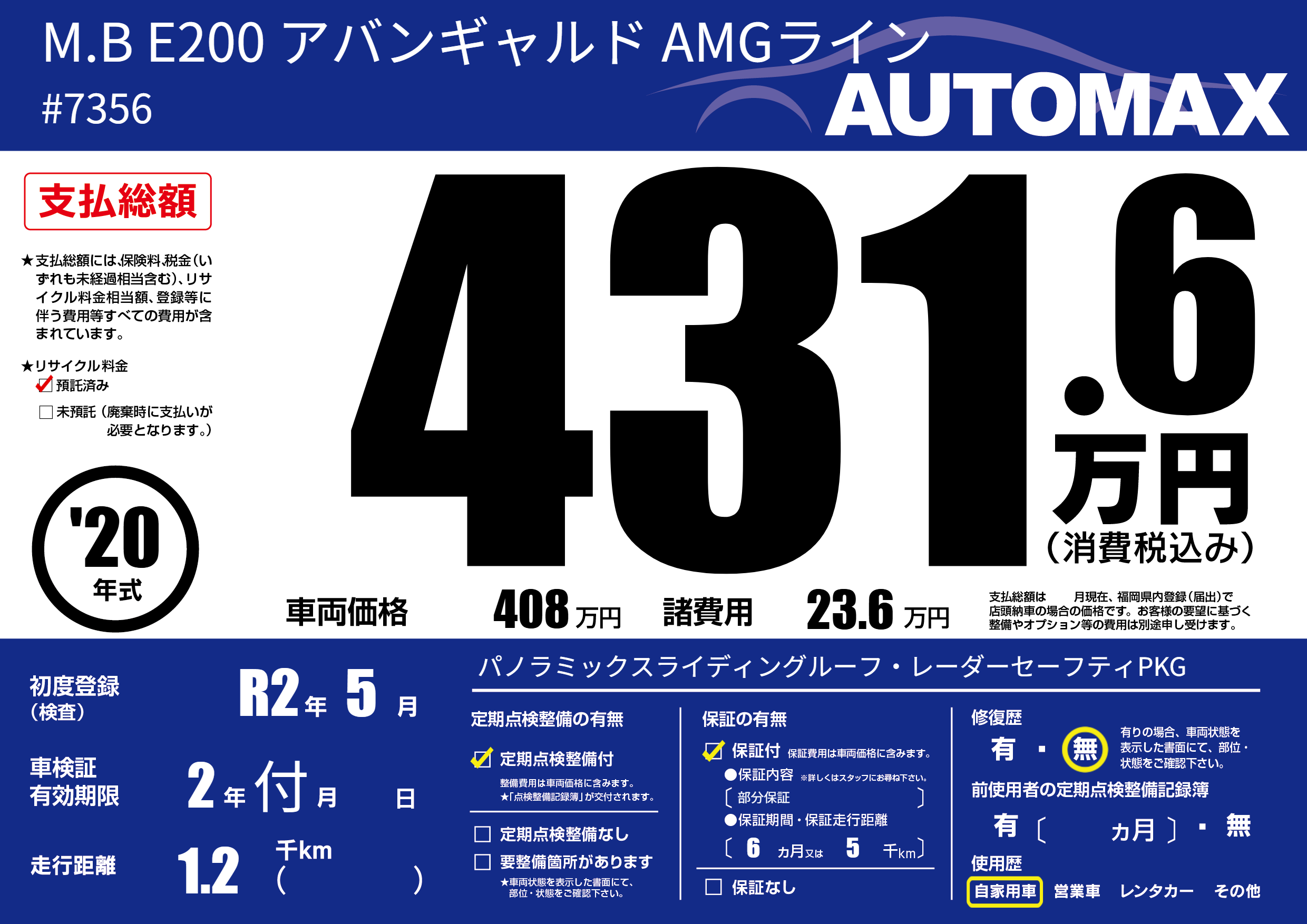 | 車名 | M.B E200 アバンギャルド AMGライン | グレード ミッション 排気量 |