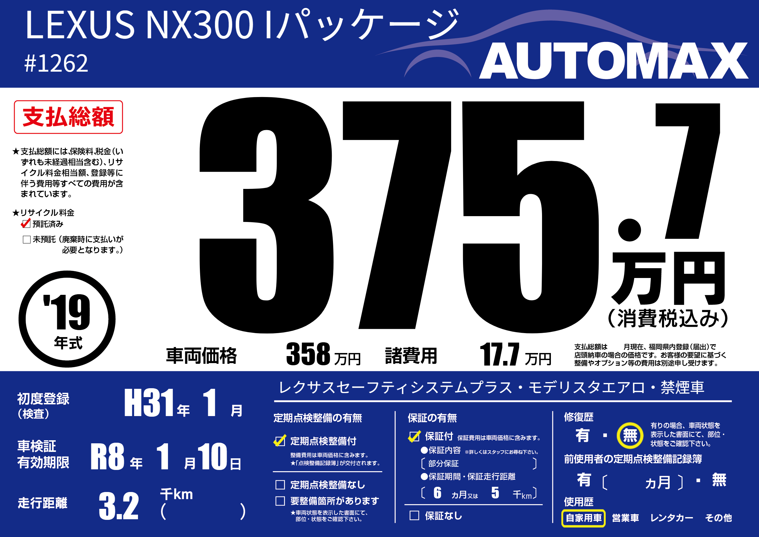 | 車名 | LEXUS NX300 Iパッケージ | グレード ミッション 排気量 |