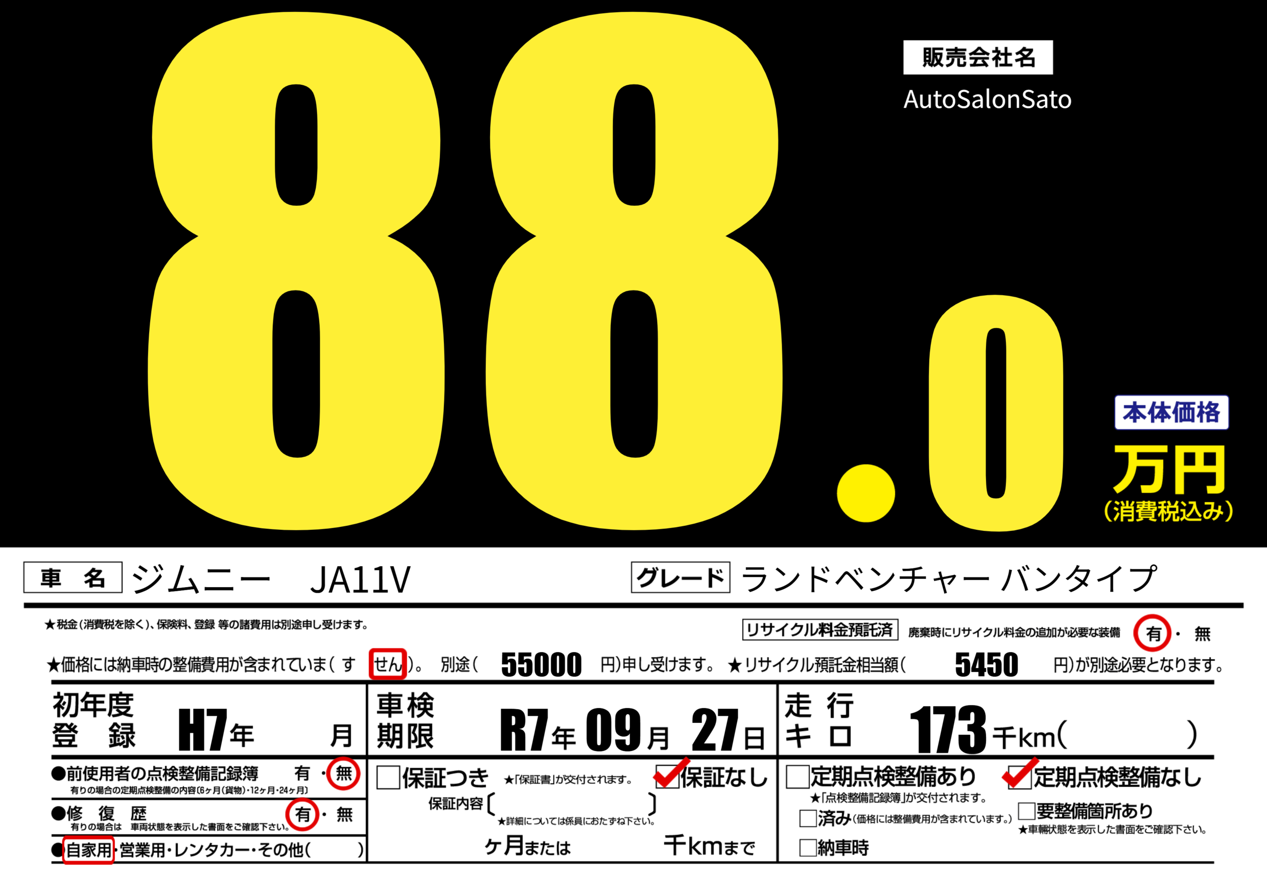 | 車名 | ジムニー JA11V | グレード ミッション 排気量 |