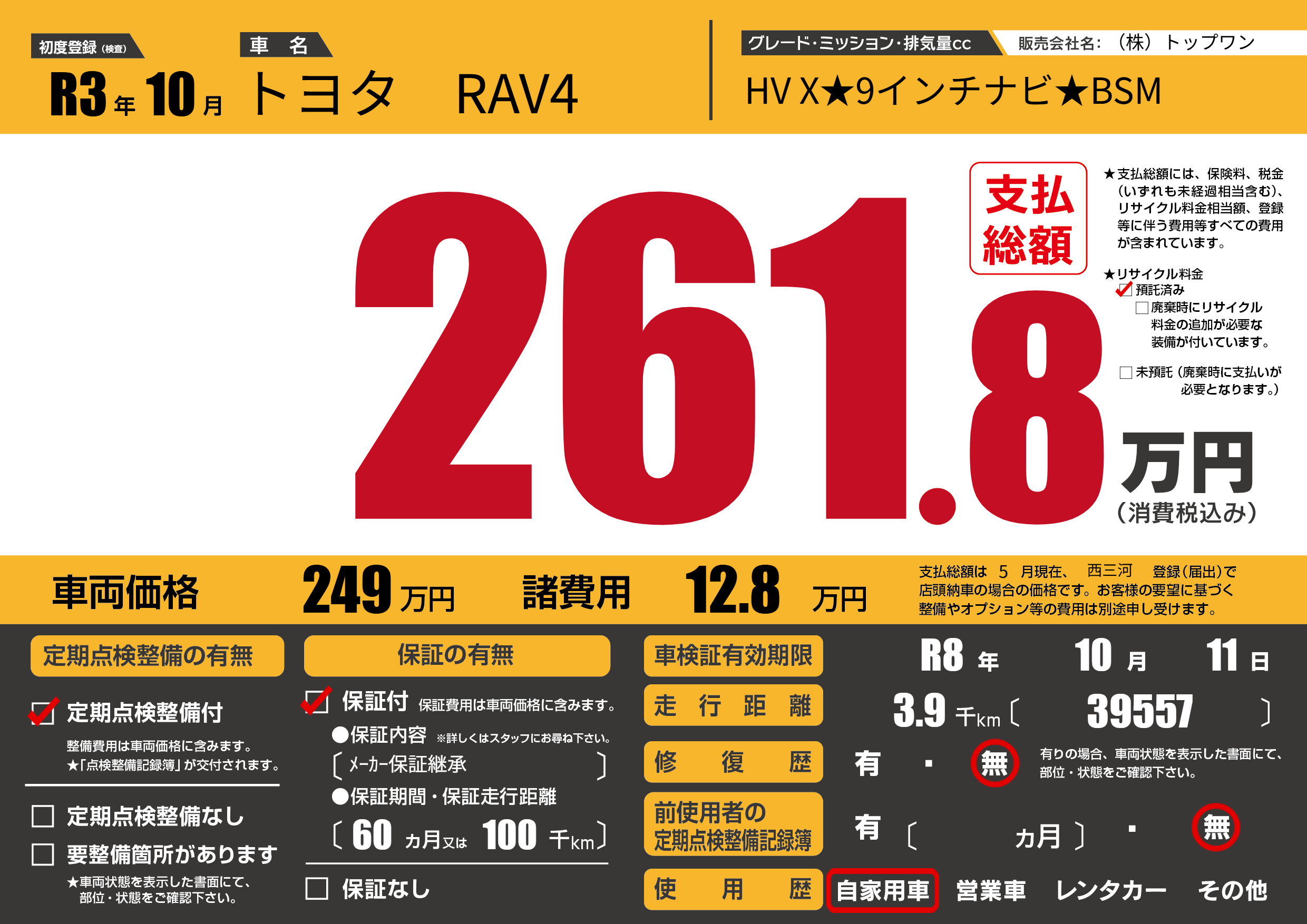 | 走行キロ | 0.3万km | 初年度登録 | R3年10月 |