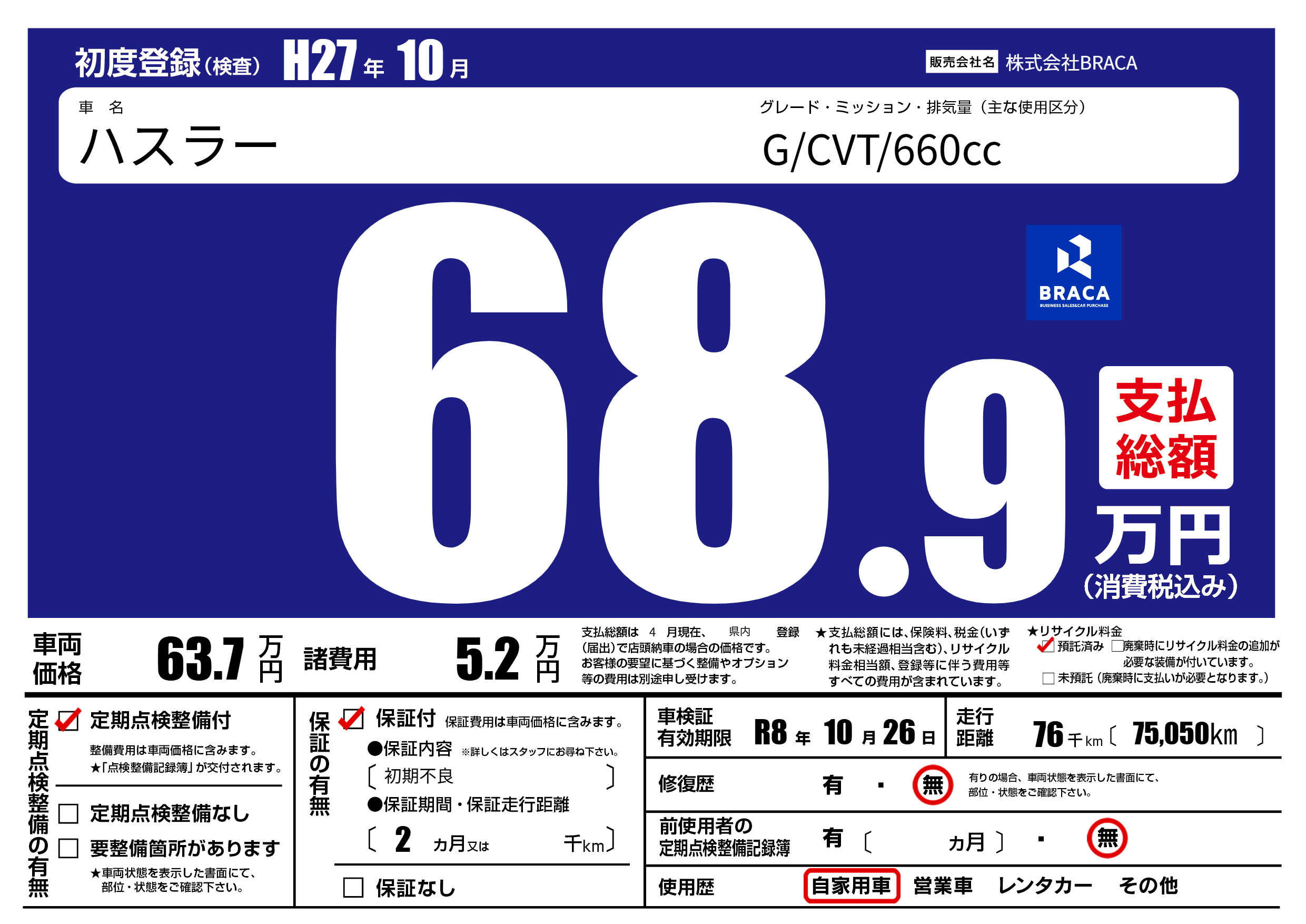 | 走行キロ | 7.6万km | 初年度登録 | H27年10月 |