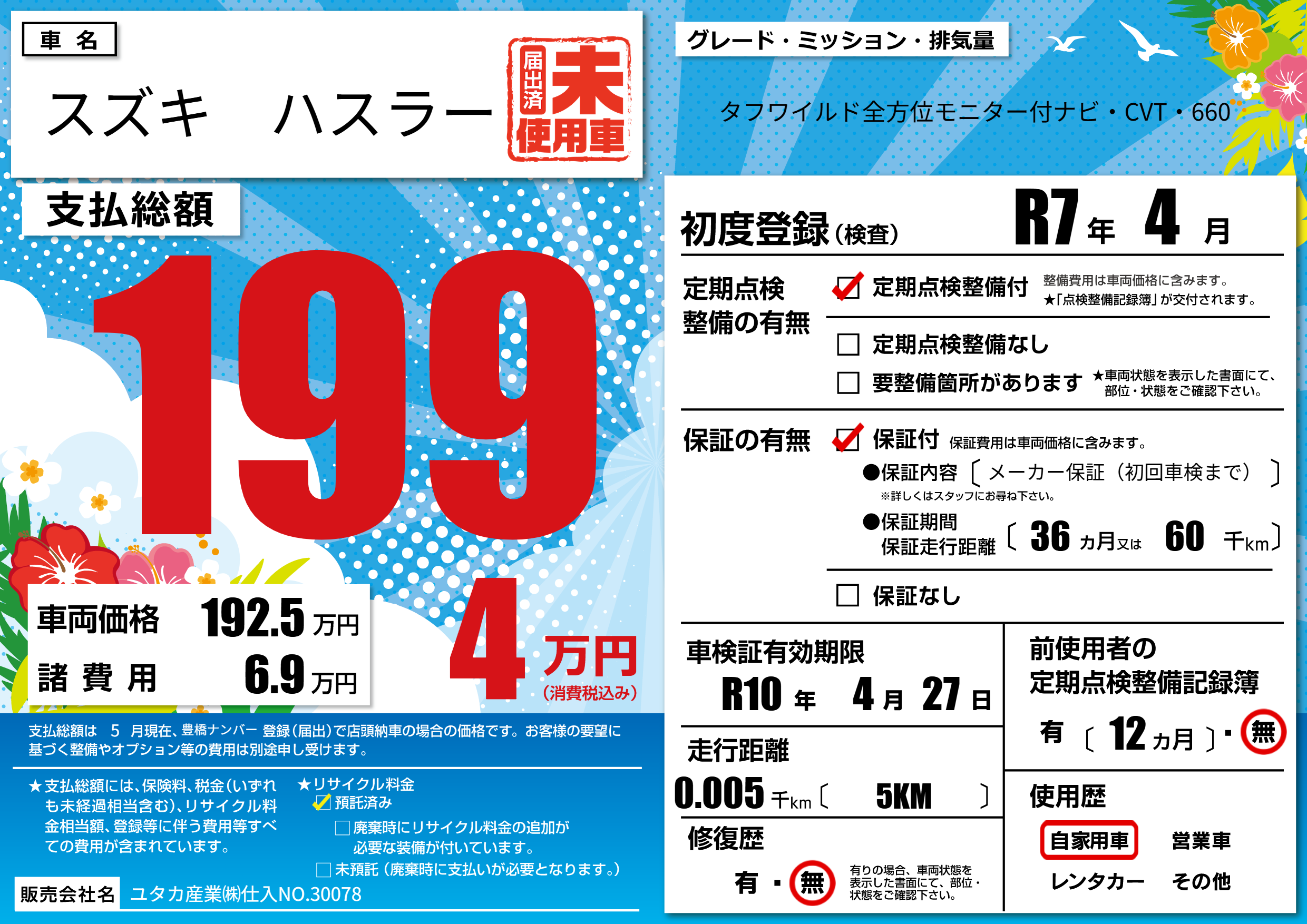 | 車名 | スズキ ハスラー | グレード ミッション 排気量 |
