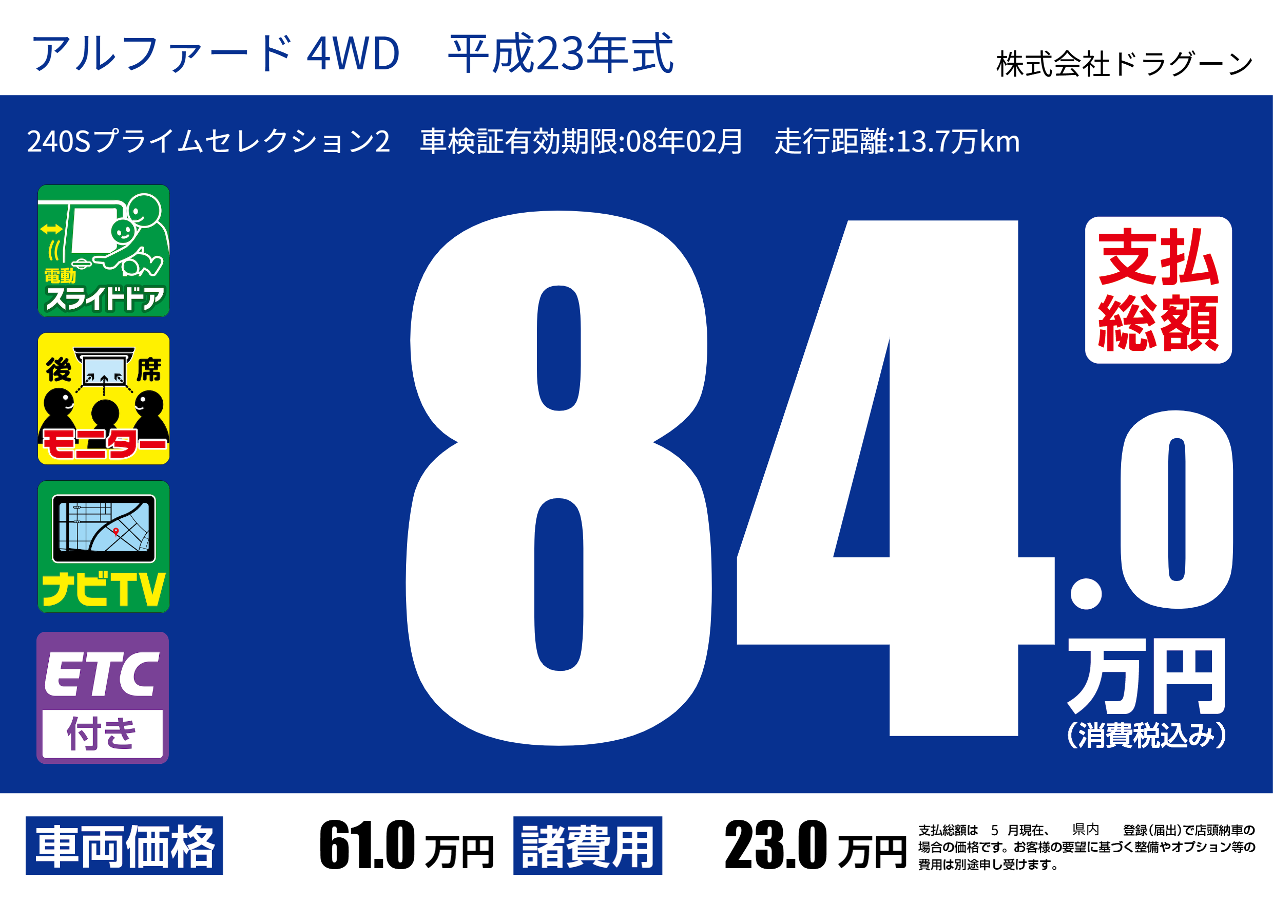| 車名 | アルファード 4WD 平成23年式 | グレード ミッション 排気量 |