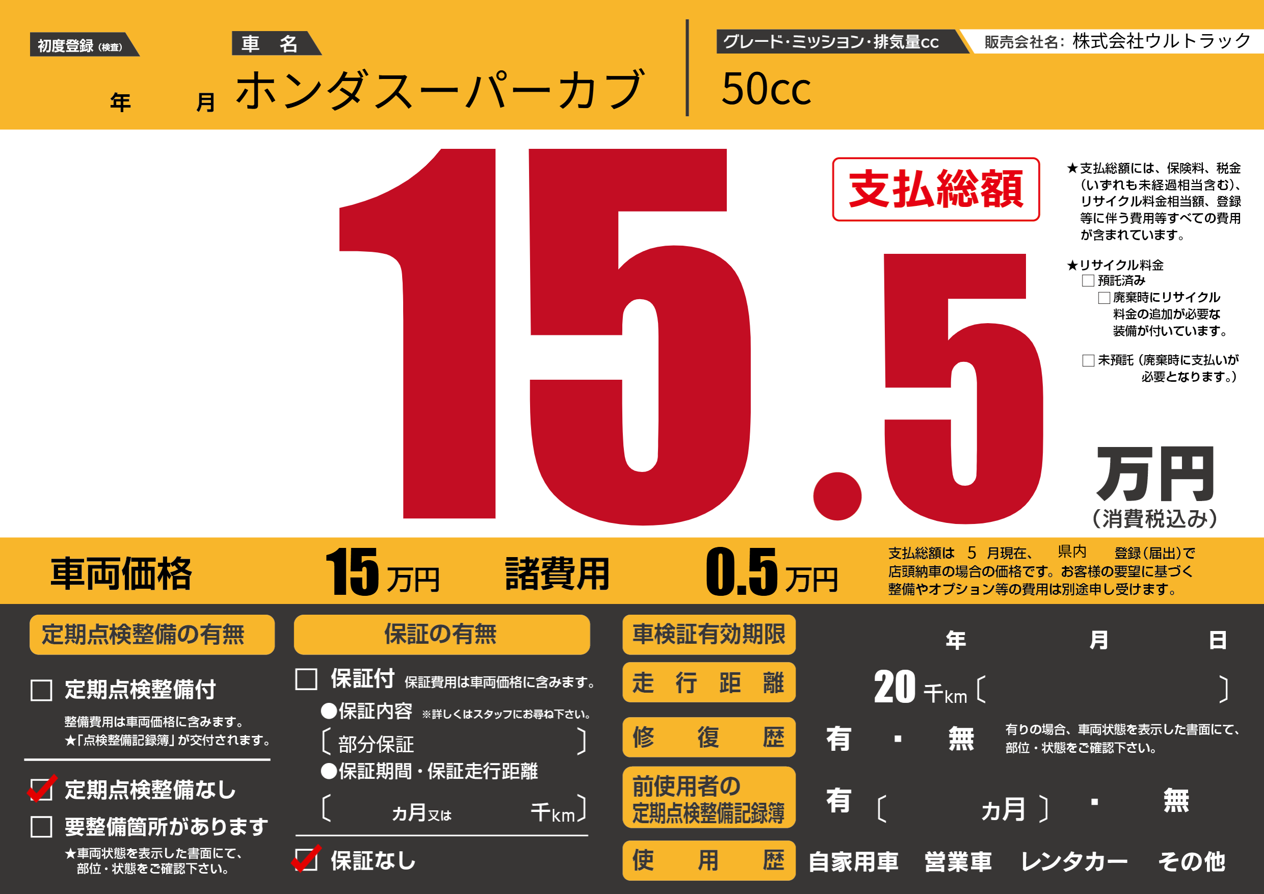 | 車名 | ホンダスーパーカブ | グレード ミッション 排気量 |