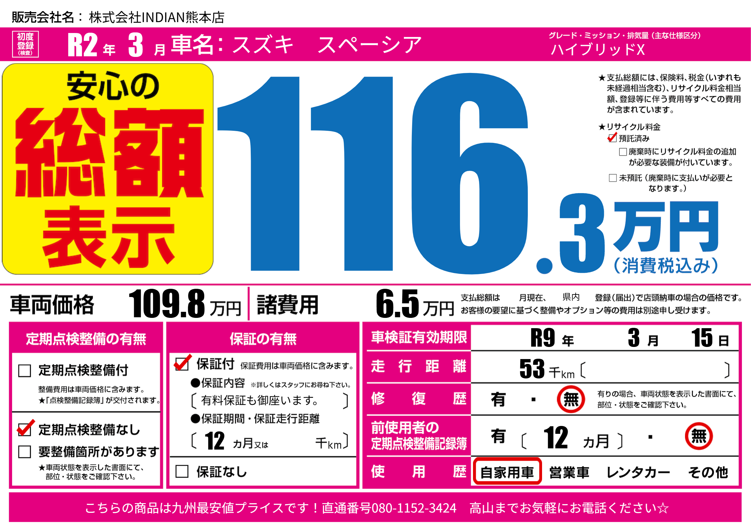 | 車検制限 | R9年 3月 15日 | ||