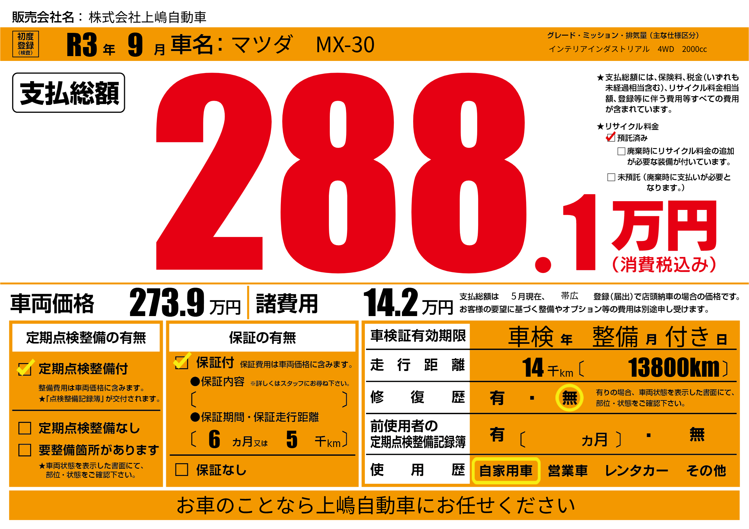 | 車名 | マツダ MX-30 | グレード ミッション 排気量 |