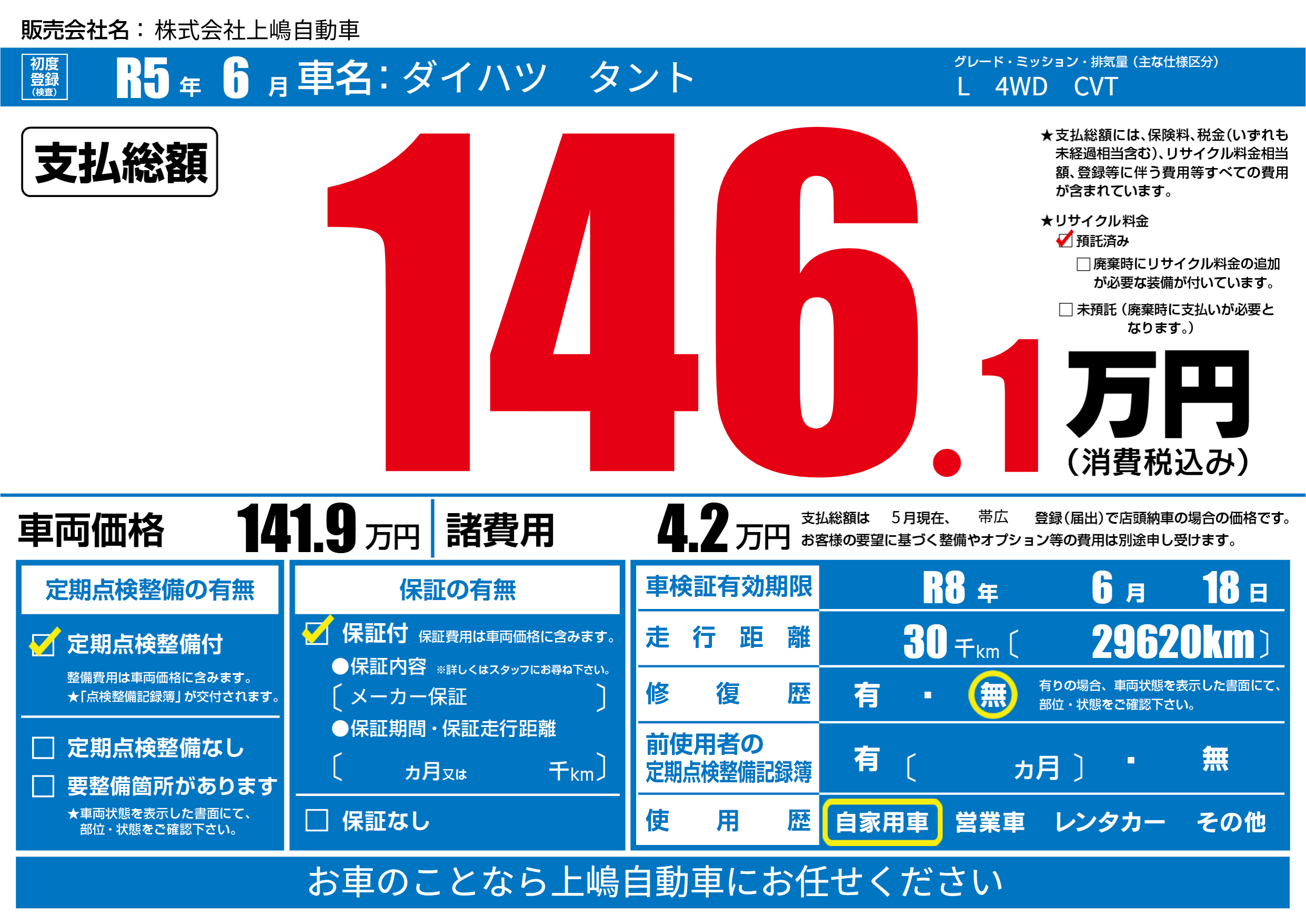 | 車名 | ダイハツ タント | グレード ミッション 排気量 |