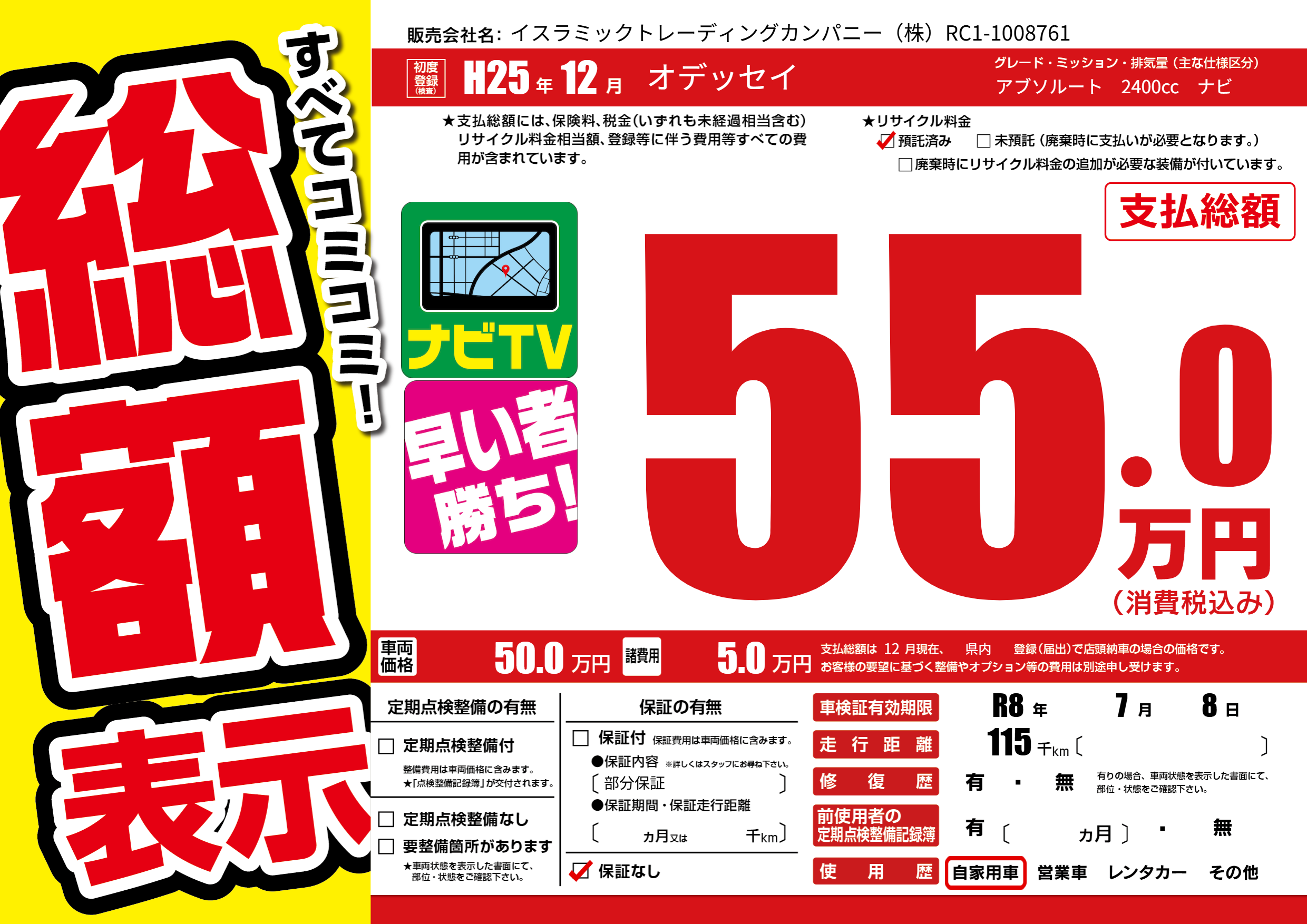 | 走行キロ | 11.5万km | 初年度登録 | H25年12月 |