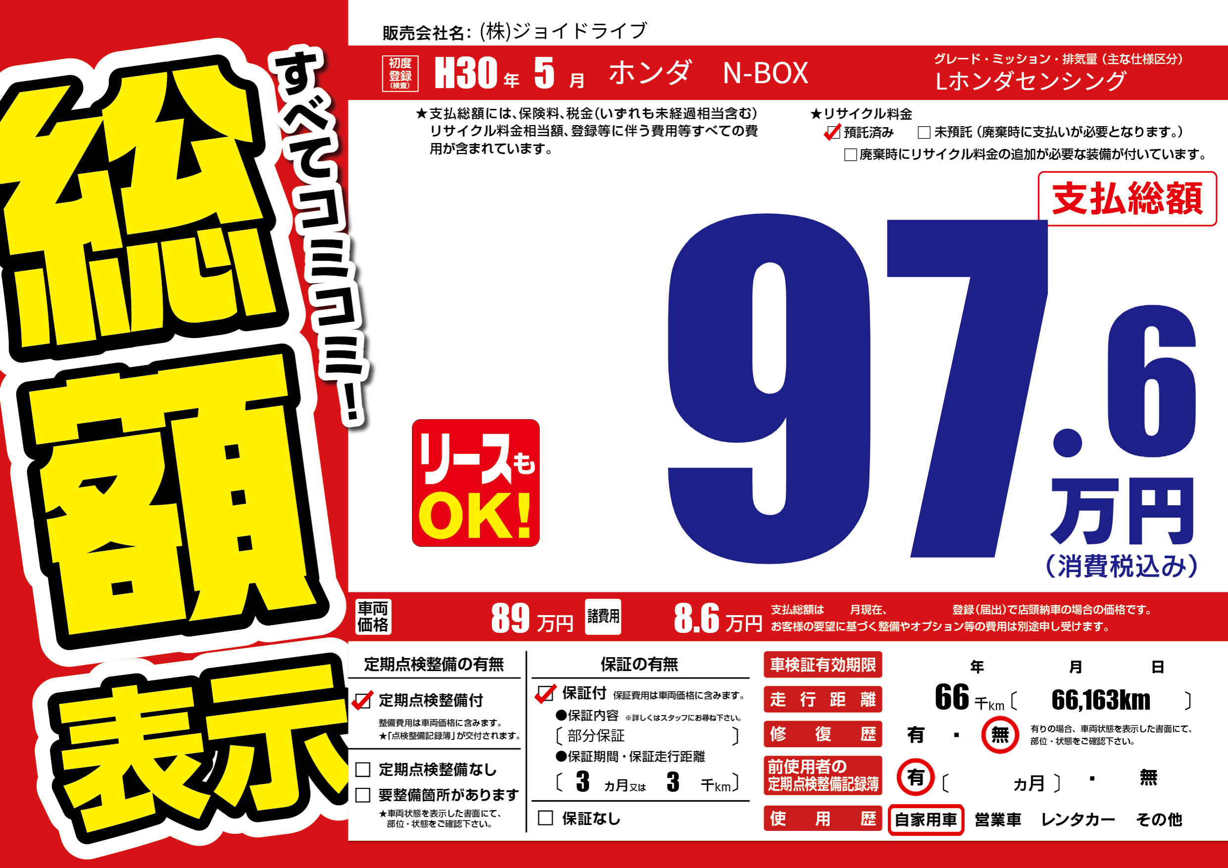 | 走行キロ | 6.6万km | 初年度登録 | H30年5月 |