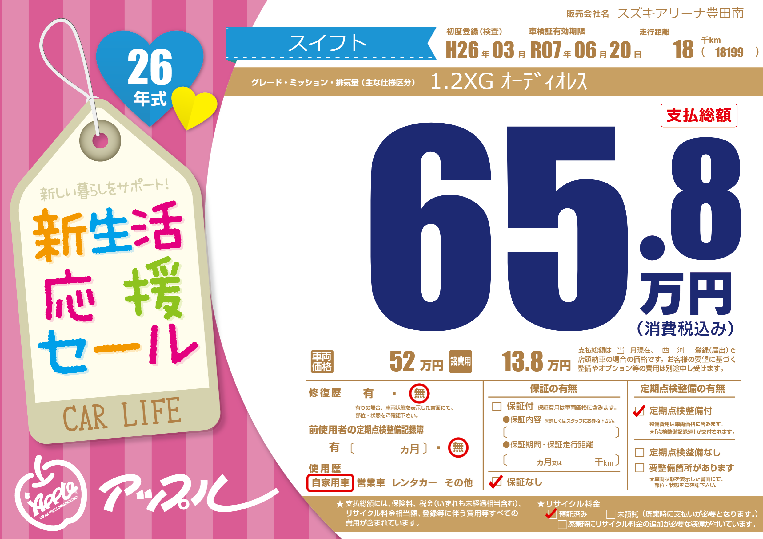 | 走行キロ | 1.8万km | 初年度登録 | H26年03月 |