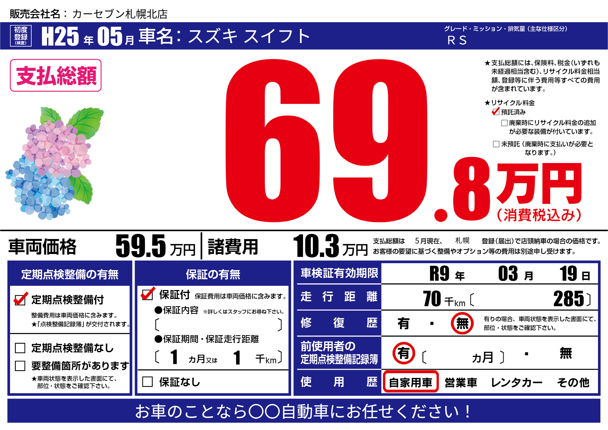 | 走行キロ | 7万km | 初年度登録 | H25年05月 |