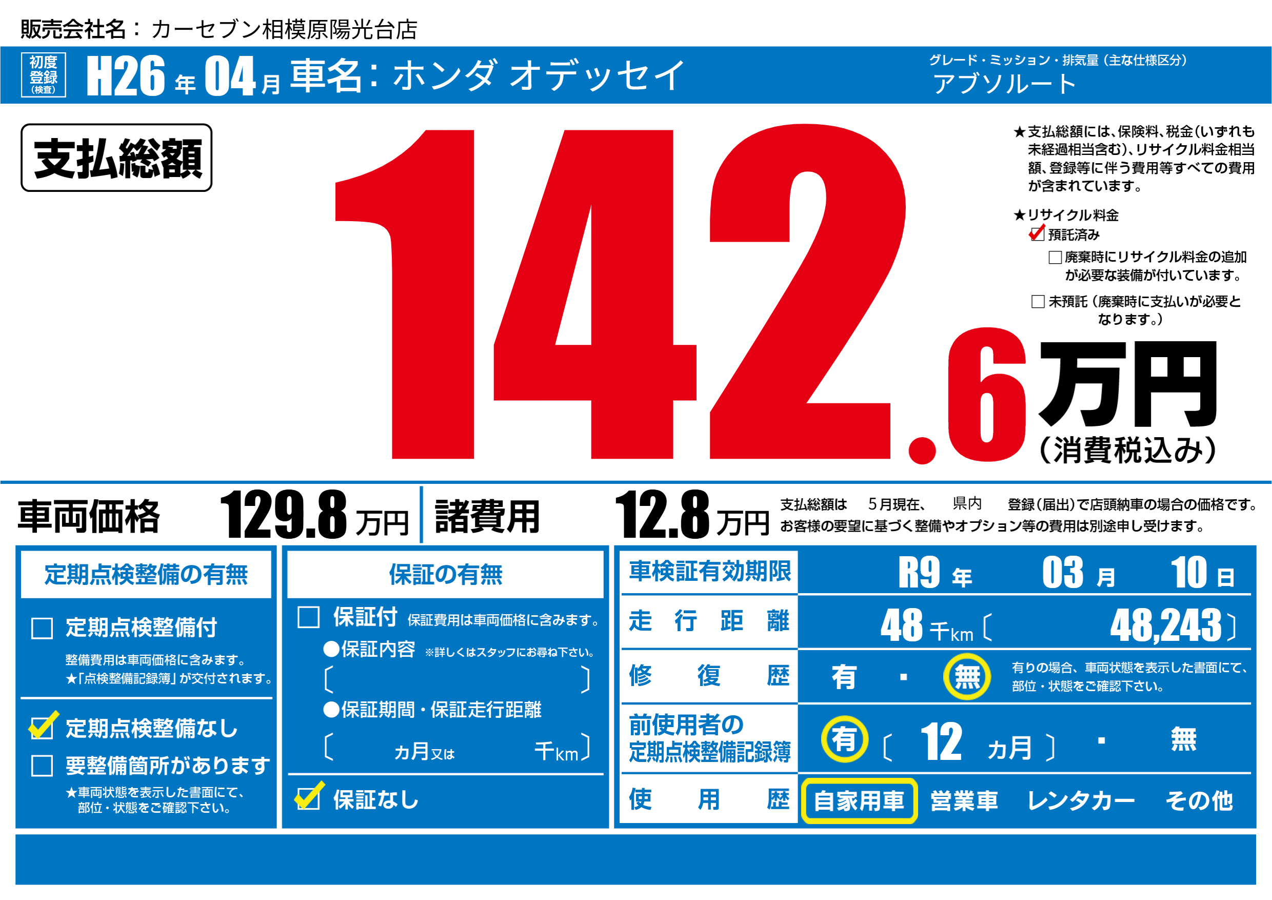 | 走行キロ | 4.8万km | 初年度登録 | H26年04月 |