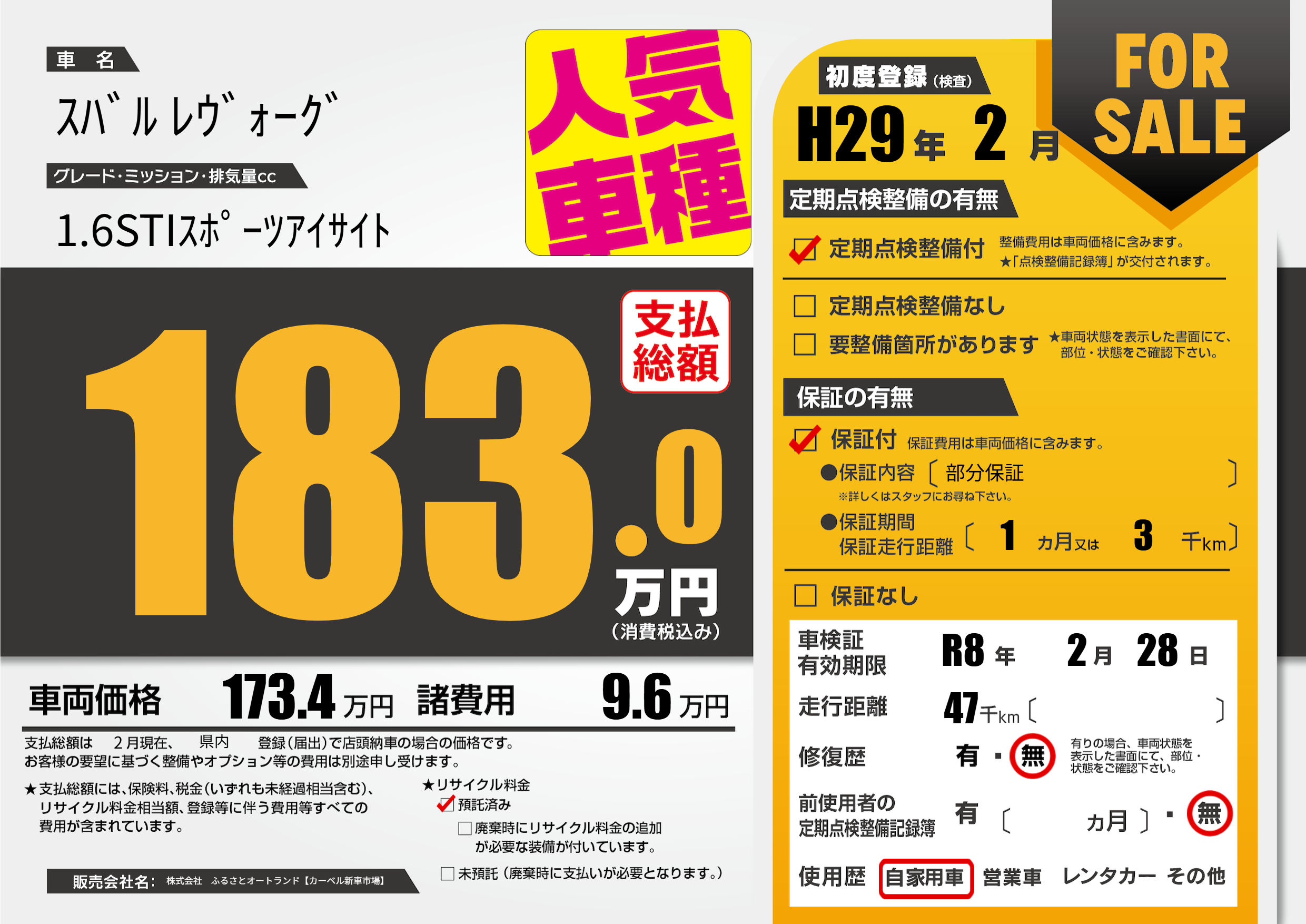| 車名 | スバル レヴォーグ | グレード ミッション 排気量 |