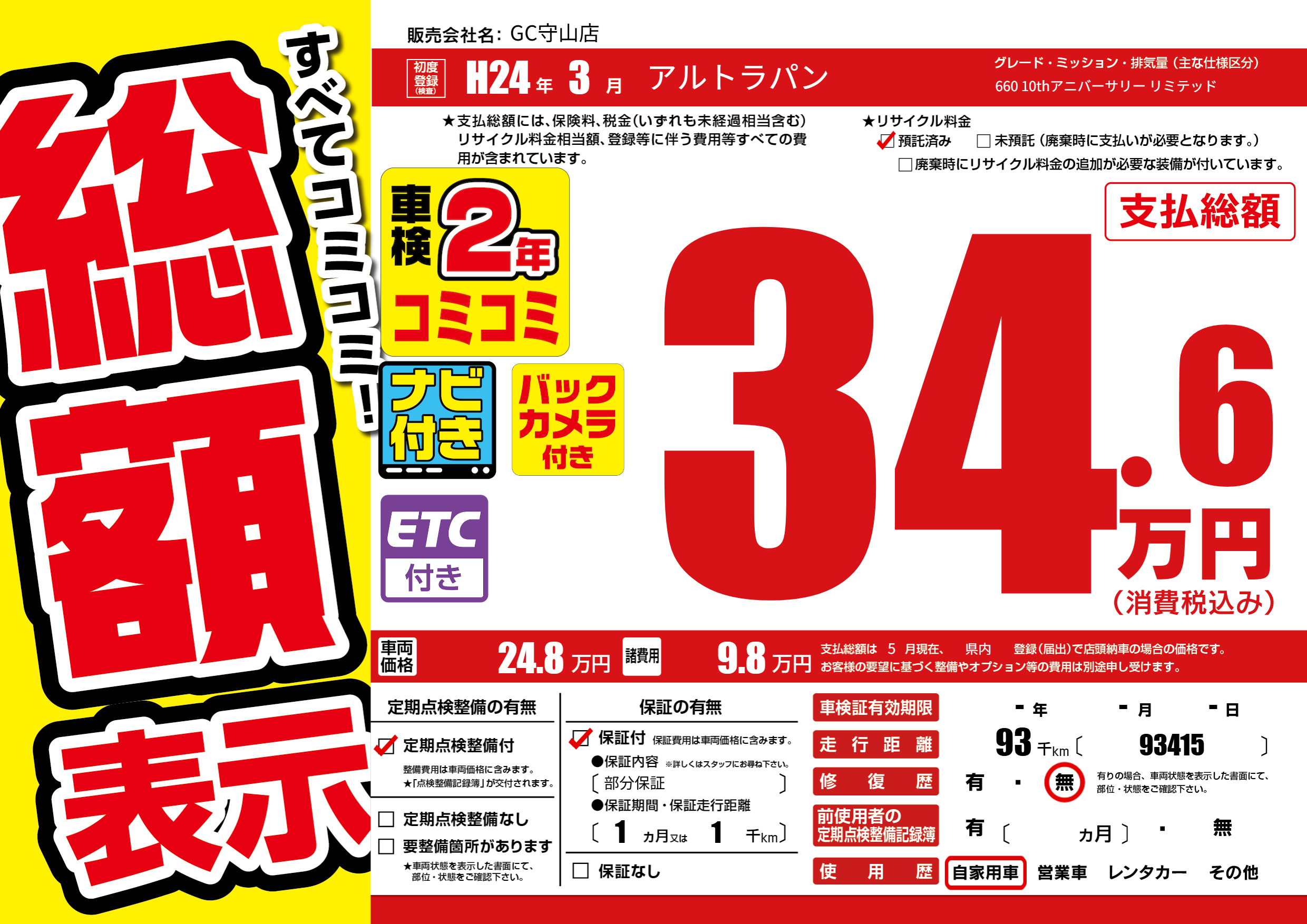| 走行キロ | 9.3万km | 初年度登録 | H24年3月 |