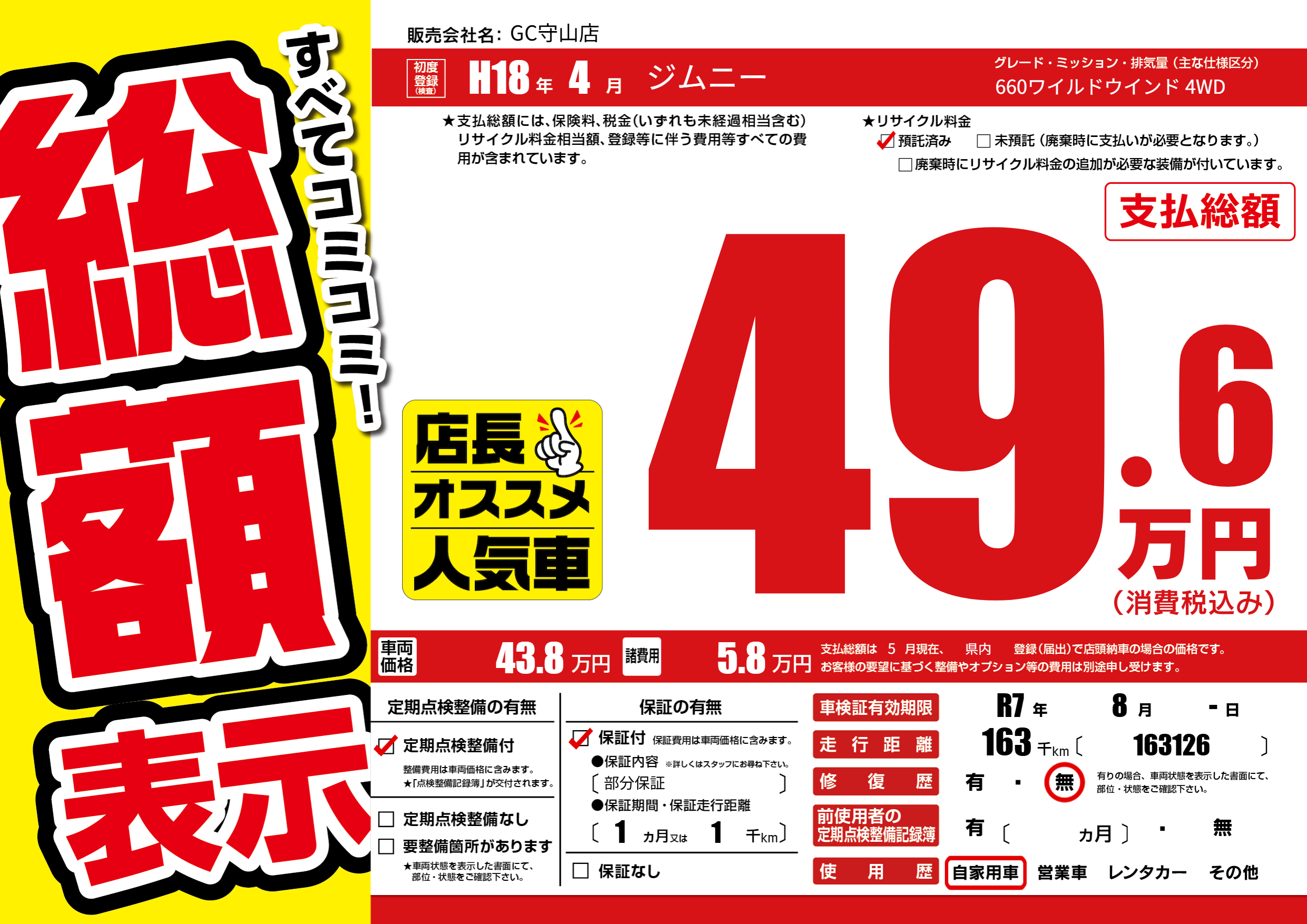 | 走行キロ | 16.3万km | 初年度登録 | H18年4月 |