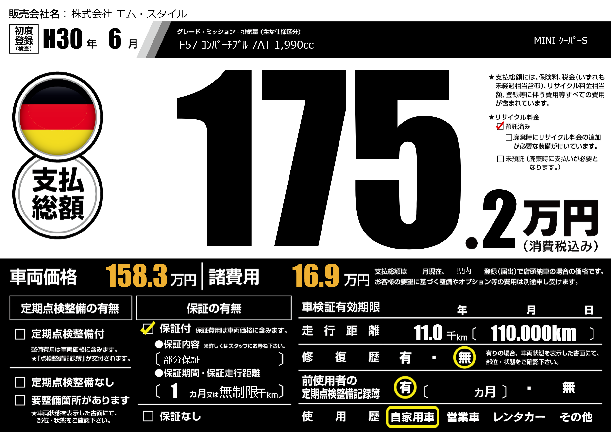 | 車名 | MINI クーパーS | グレード ミッション 排気量 |