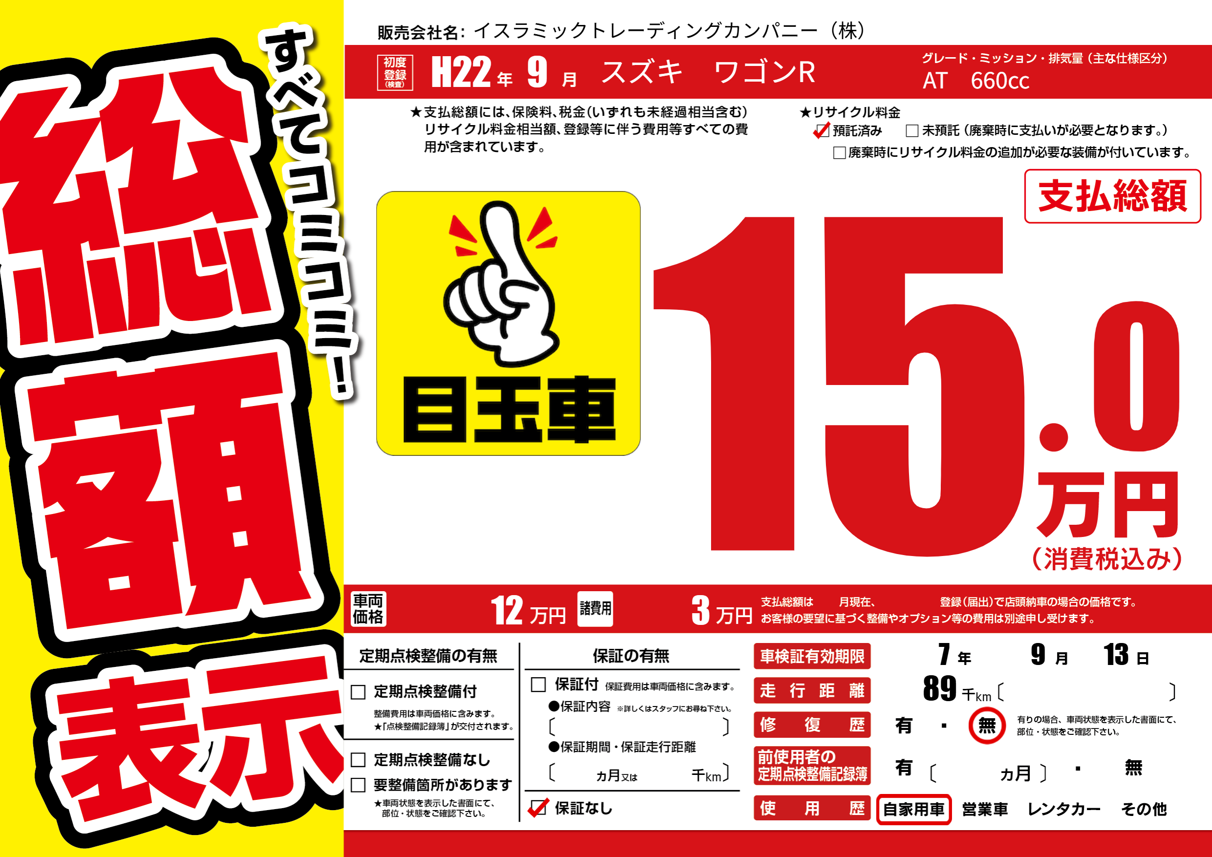 | 車名 | スズキ ワゴンR | グレード ミッション 排気量 |