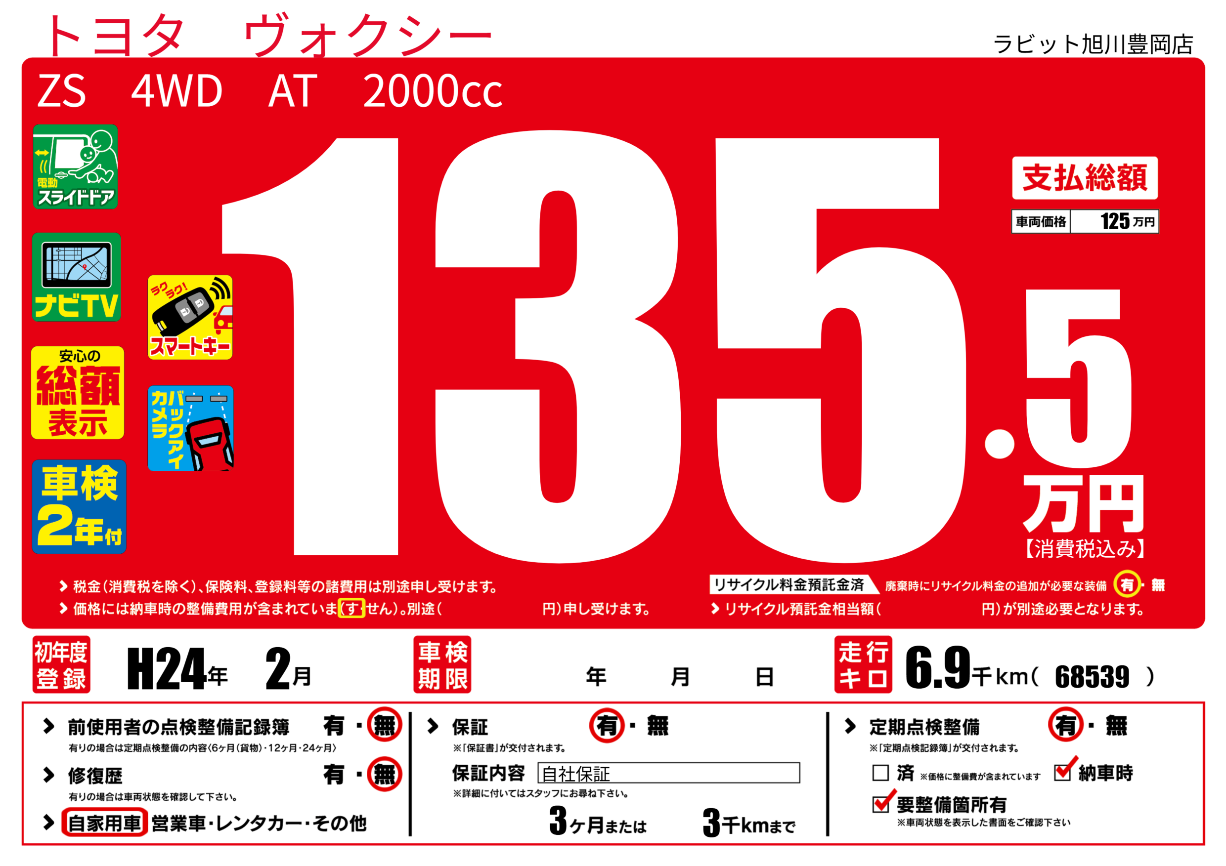 | 走行キロ | 0.6万km | 初年度登録 | H24年2月 |