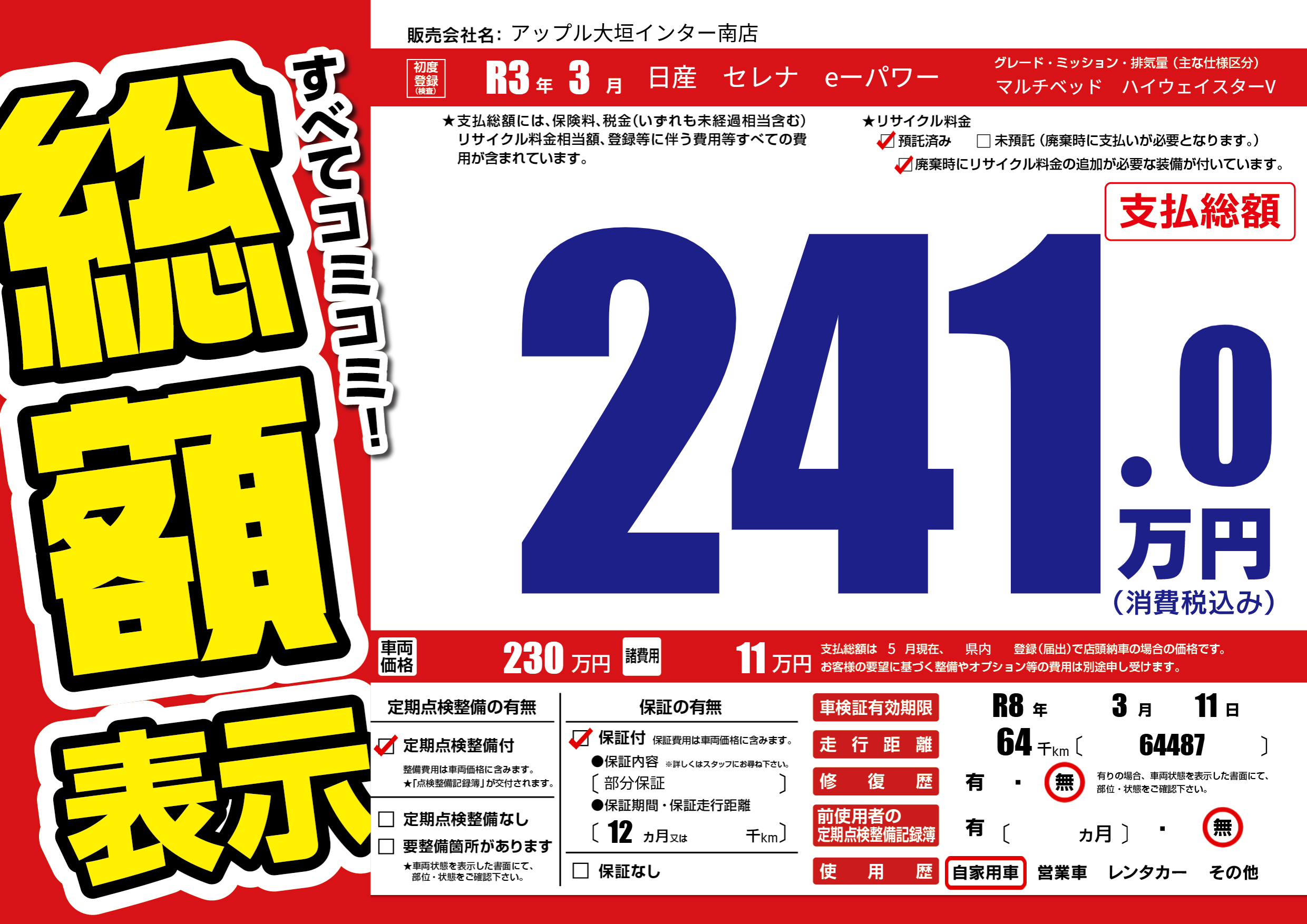| 車名 | 日産 セレナ eーパワー | グレード ミッション 排気量 |