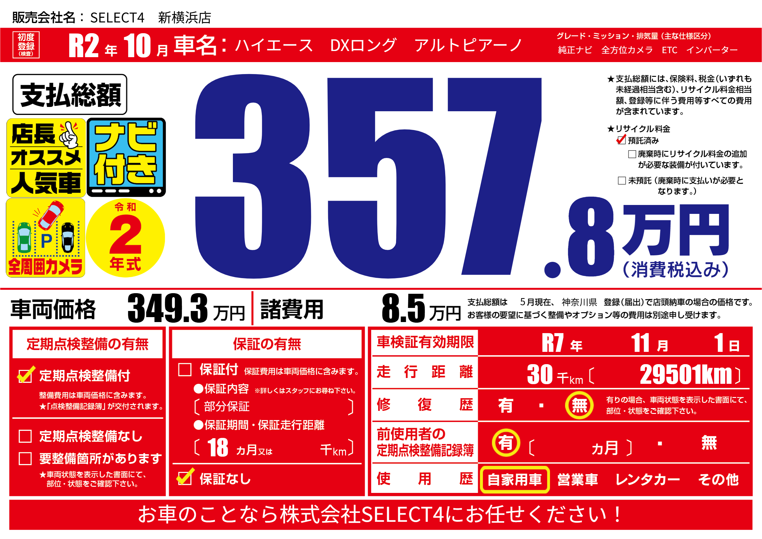 | 車名 | ハイエース DXロング アルトピアーノ | グレード ミッション 排気量 |