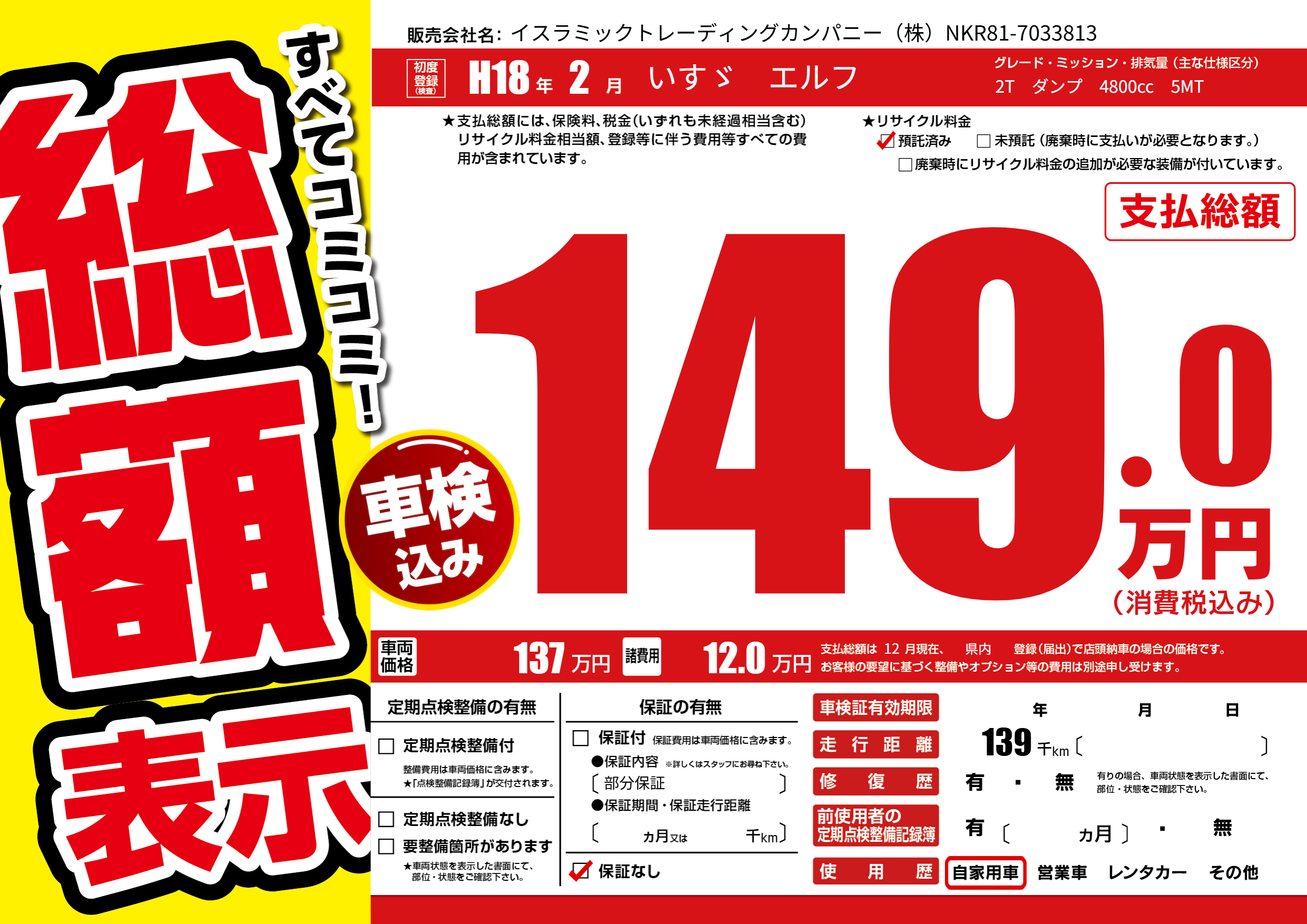 | 車名 | いすゞ エルフ | グレード ミッション 排気量 |