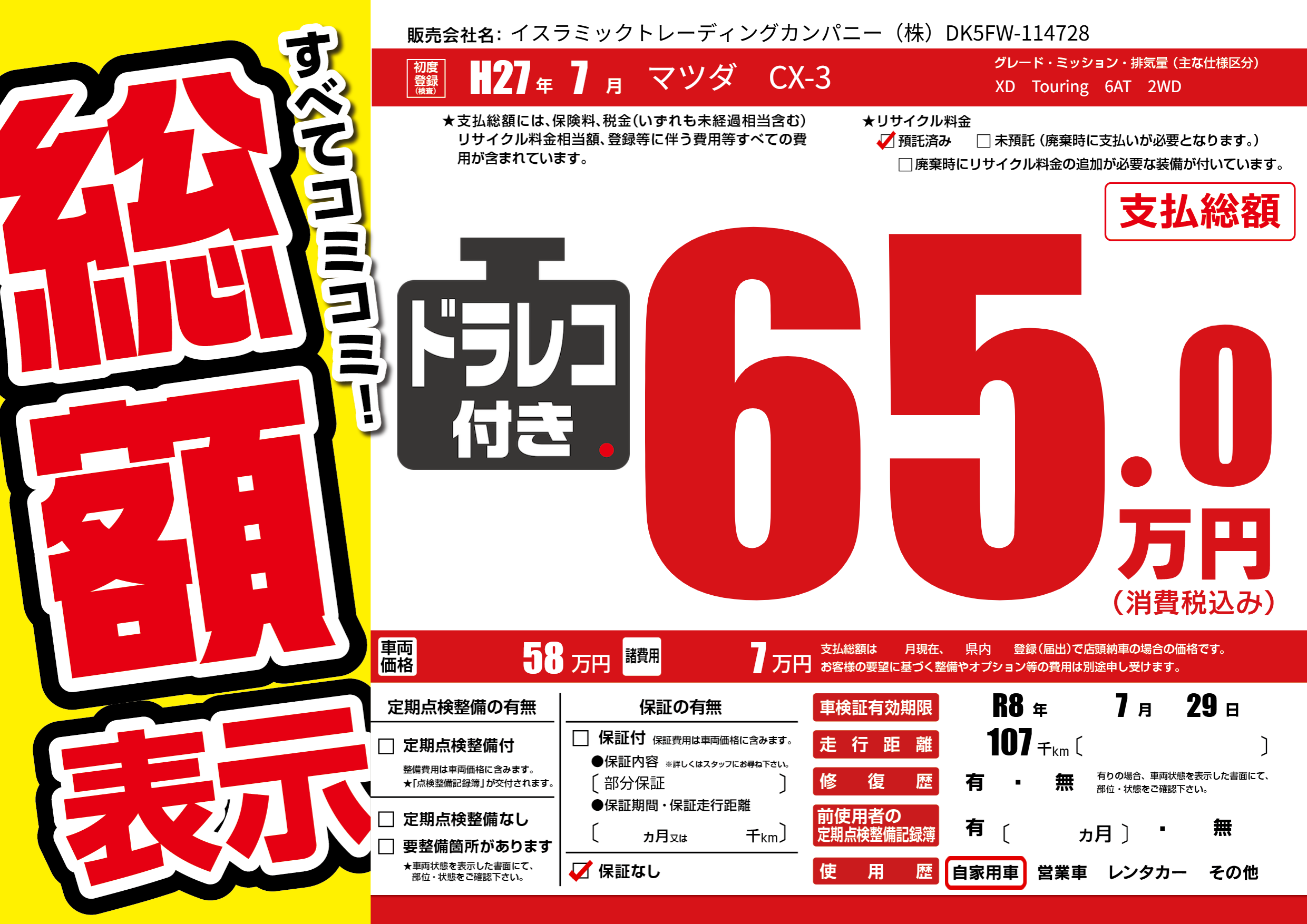 | 車名 | マツダ CX-3 | グレード ミッション 排気量 |