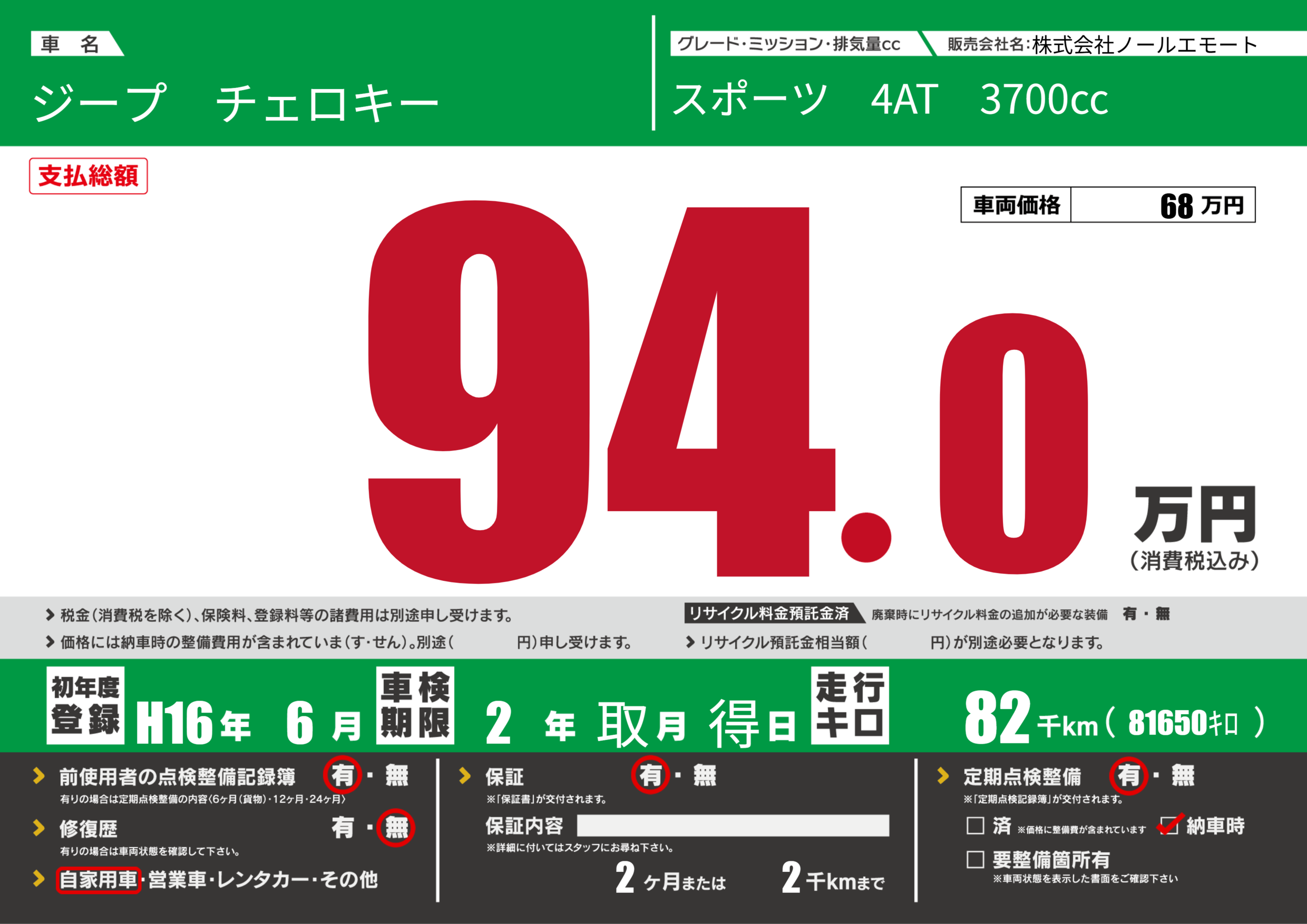 | 車名 | ジープ チェロキー | グレード ミッション 排気量 |