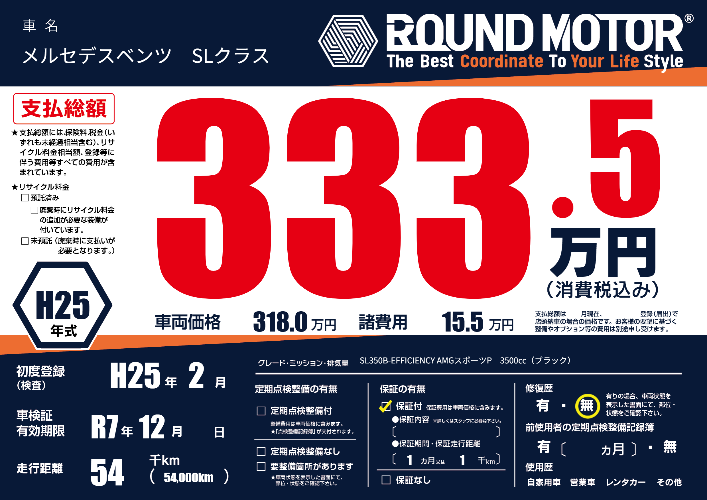 | 車名 | メルセデスベンツ SLクラス | グレード ミッション 排気量 |