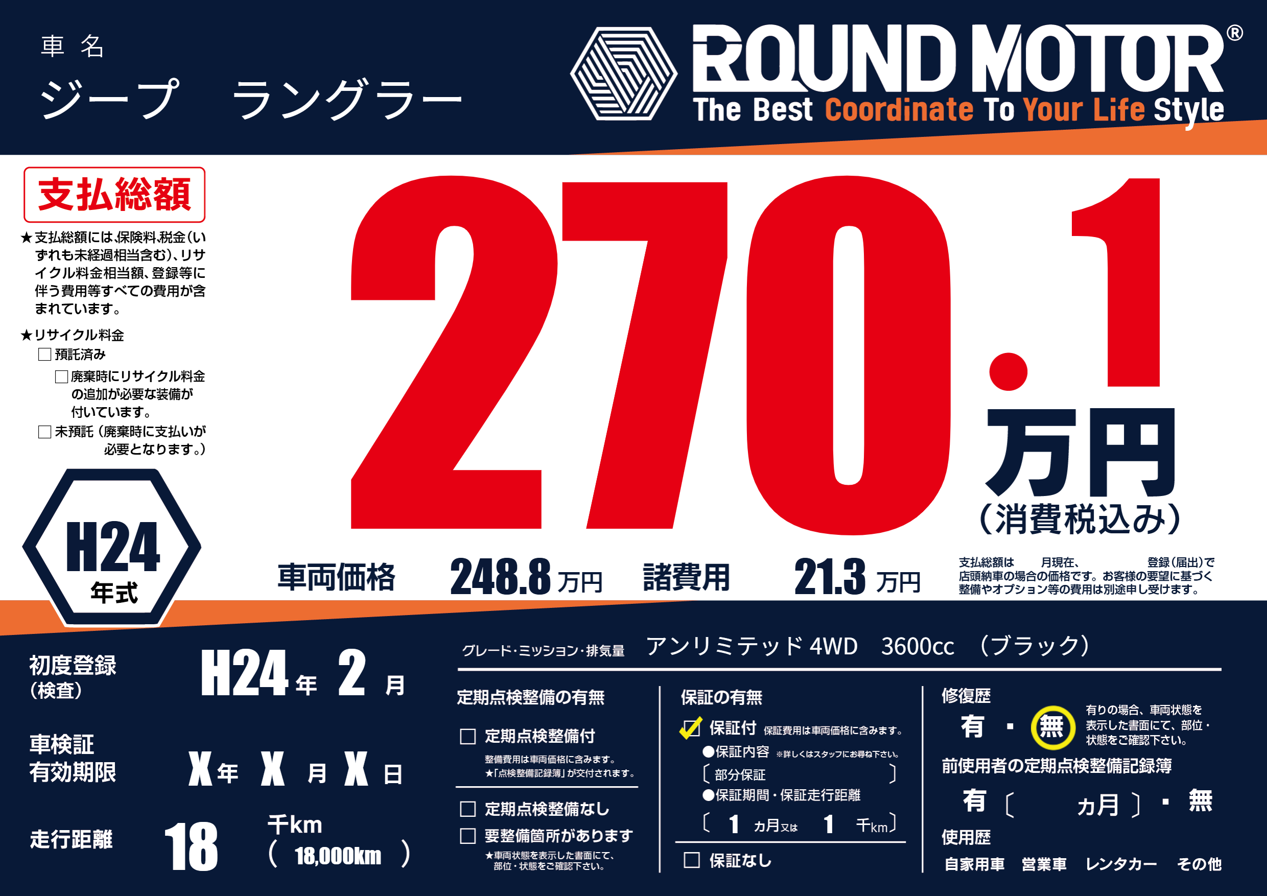 | 車名 | ジープ ラングラー | グレード ミッション 排気量 |