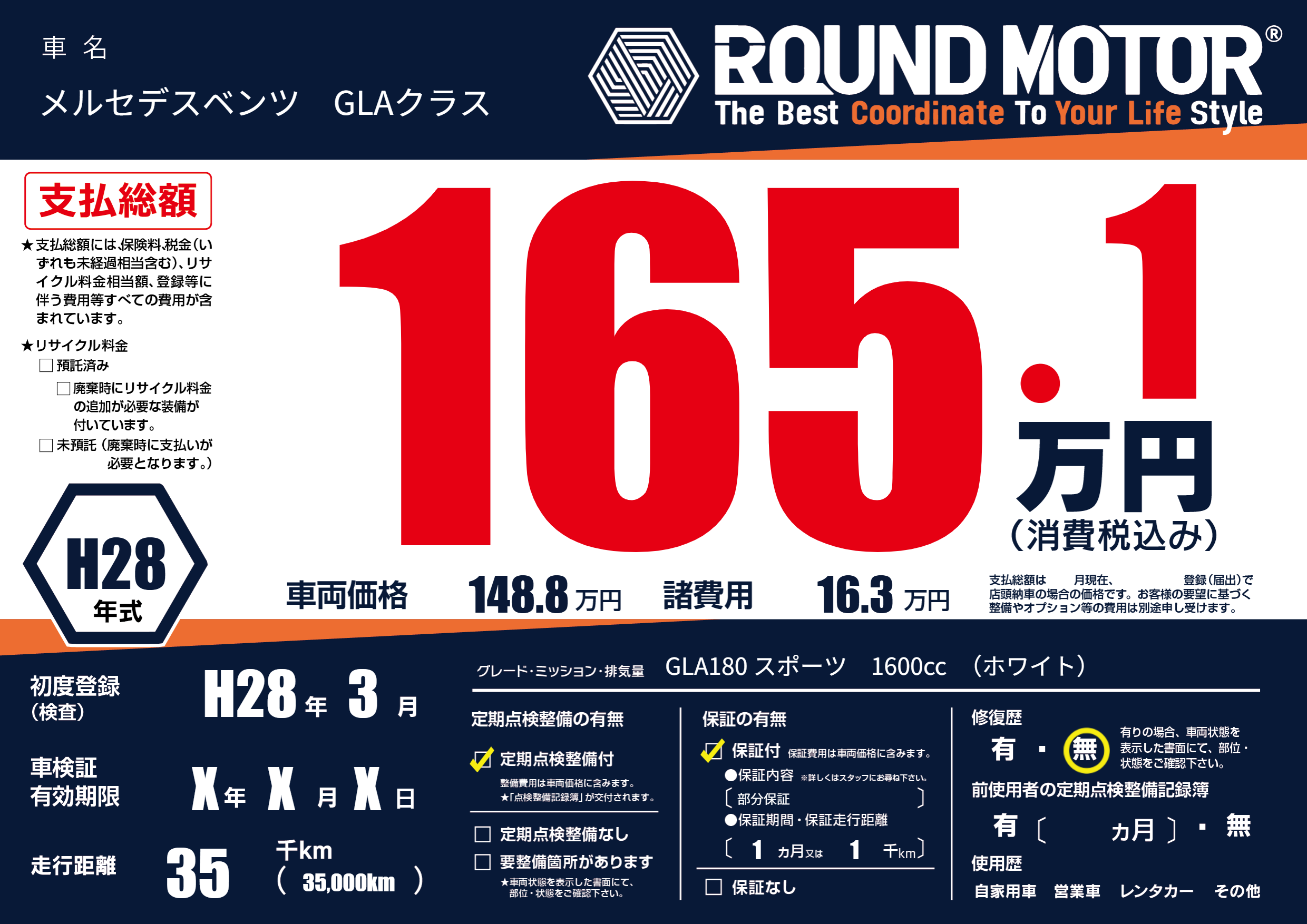 | 車名 | メルセデスベンツ GLAクラス | グレード ミッション 排気量 |