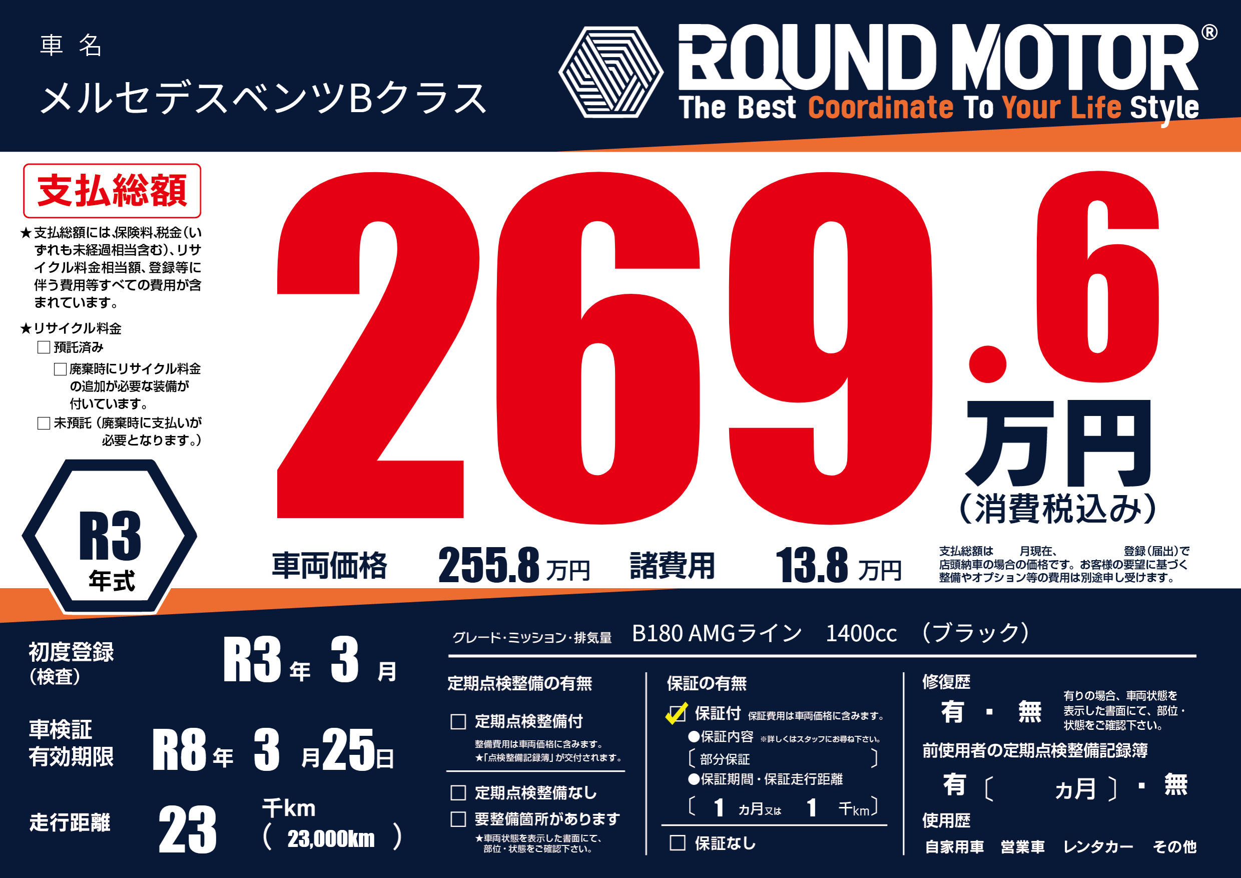 | 車名 | メルセデスベンツBクラス | グレード ミッション 排気量 |