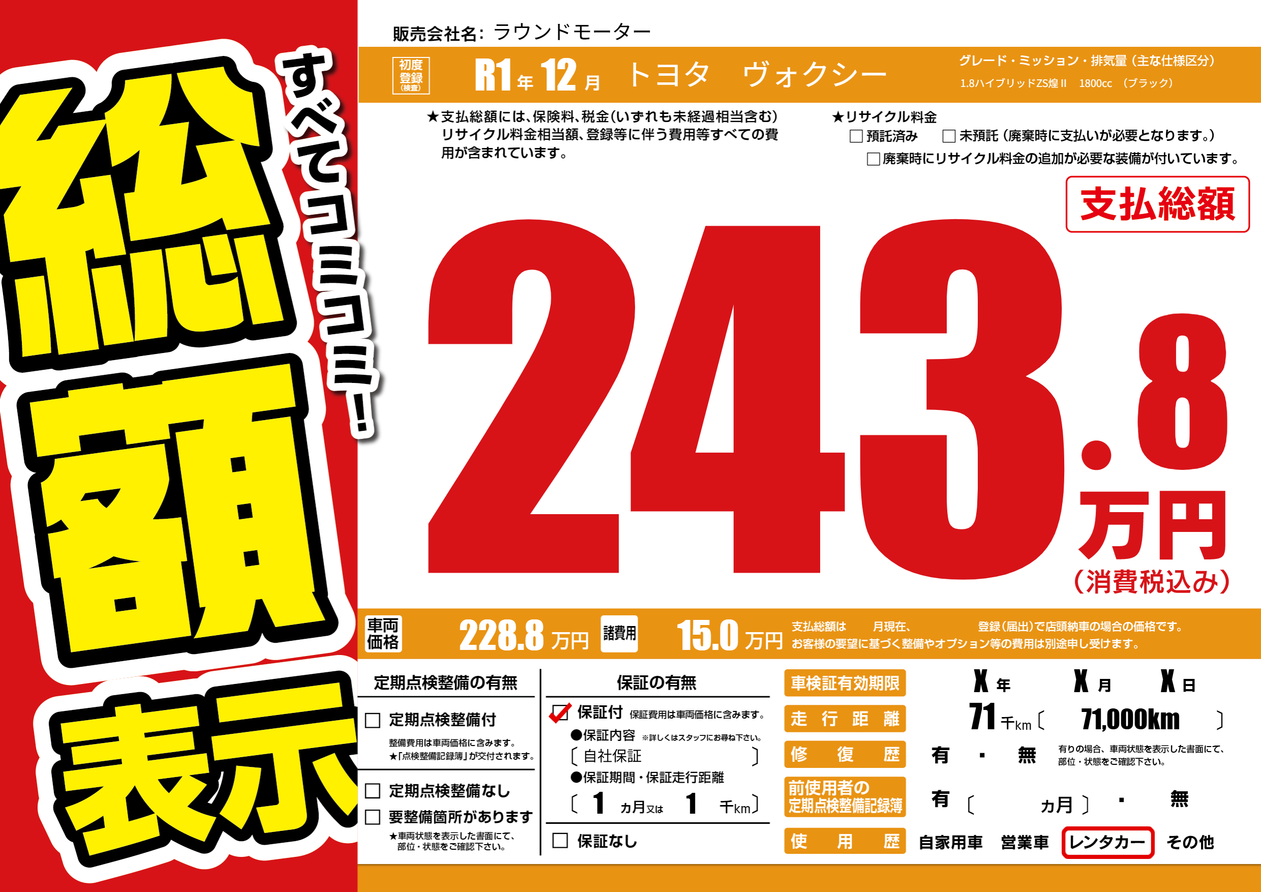 | 走行キロ | 7.1万km | 初年度登録 | R1年12月 |