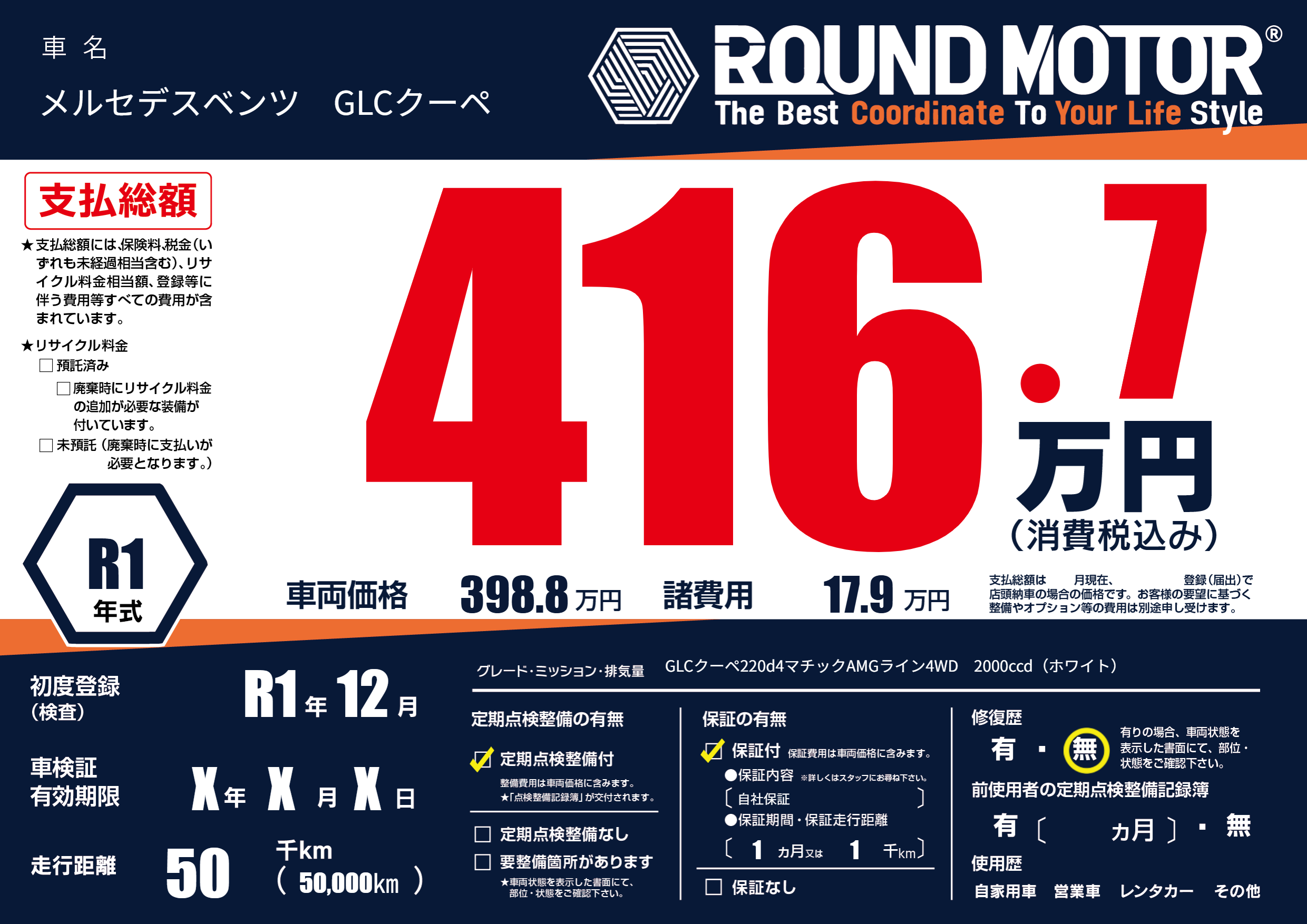 | 車名 | メルセデスベンツ GLCクーペ | グレード ミッション 排気量 |