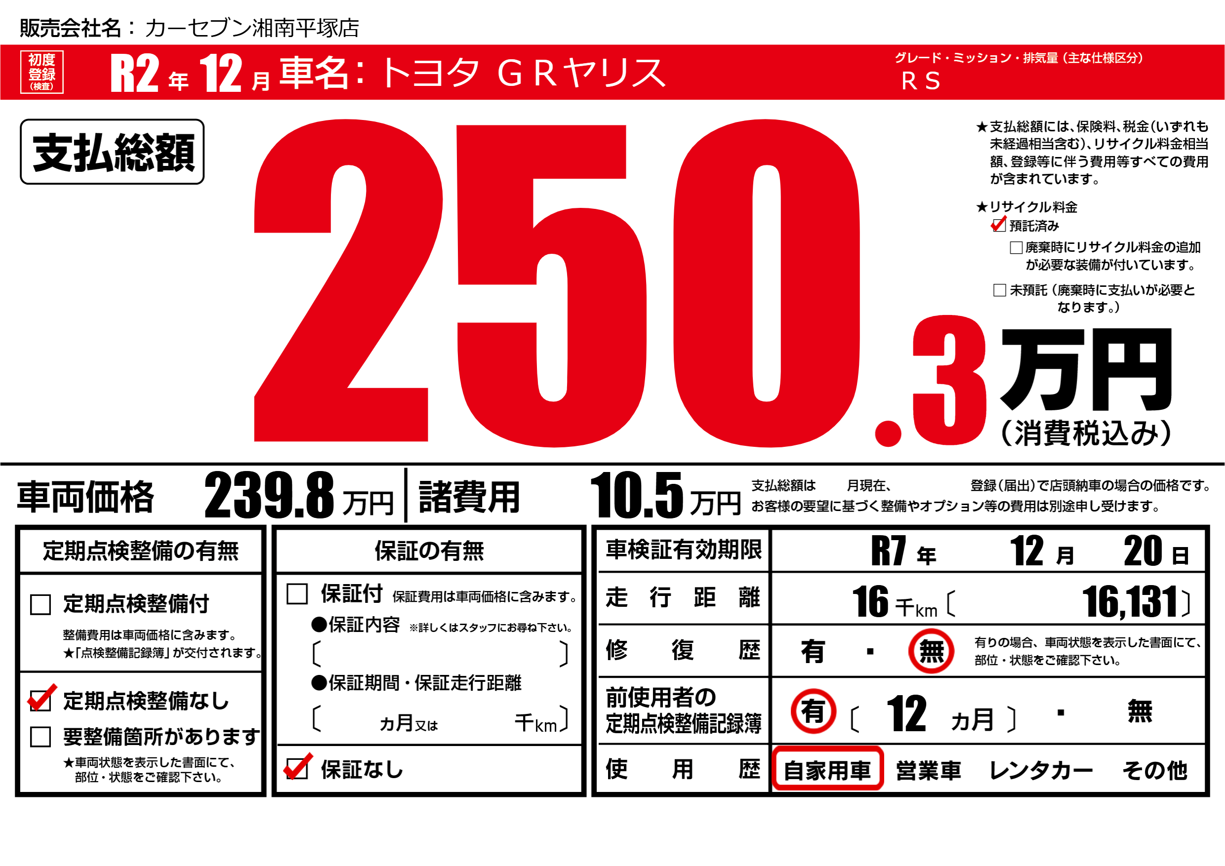 | 車名 | トヨタ GRヤリス | グレード ミッション 排気量 |