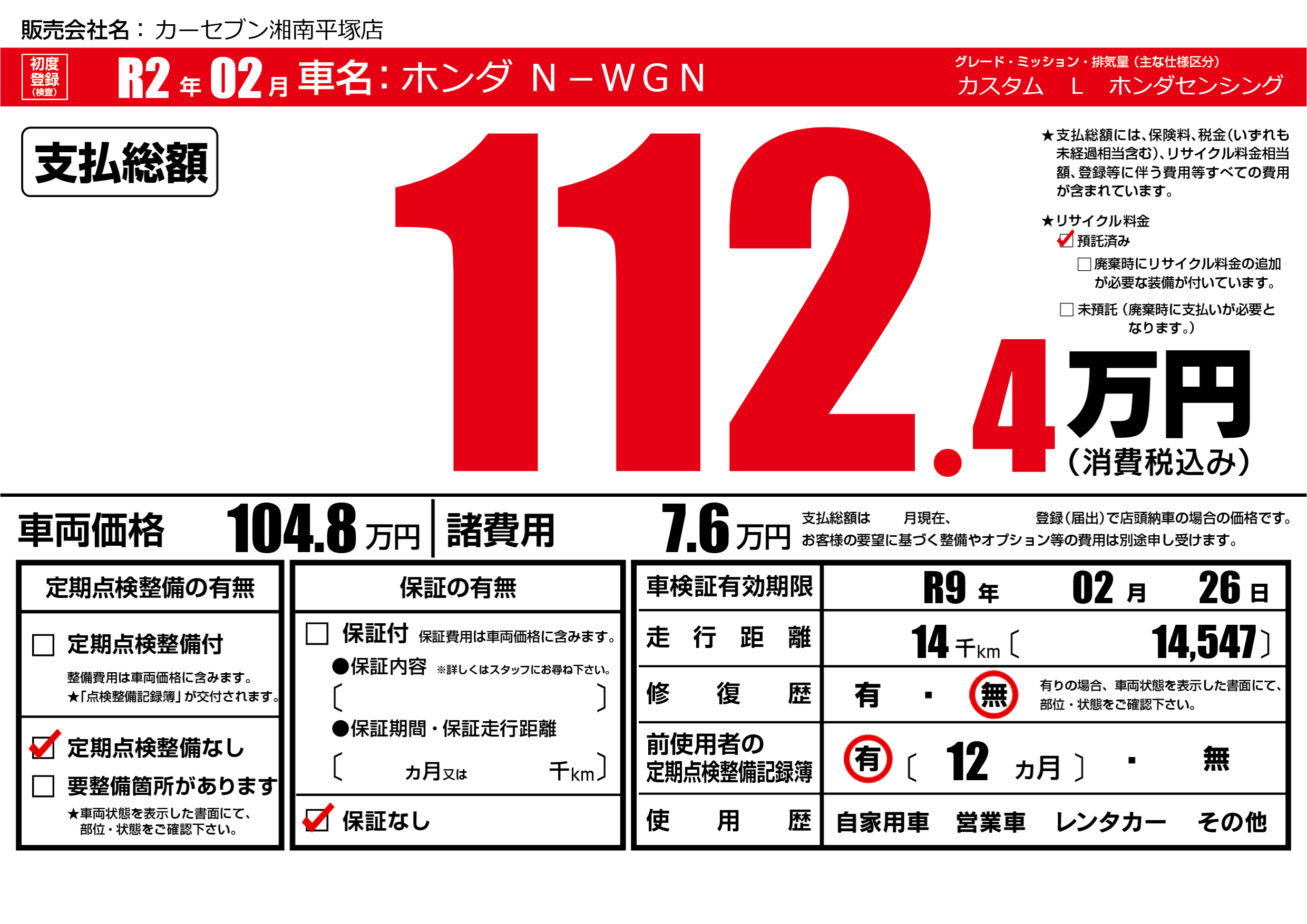 | 車名 | ホンダ N-WGN | グレード ミッション 排気量 |