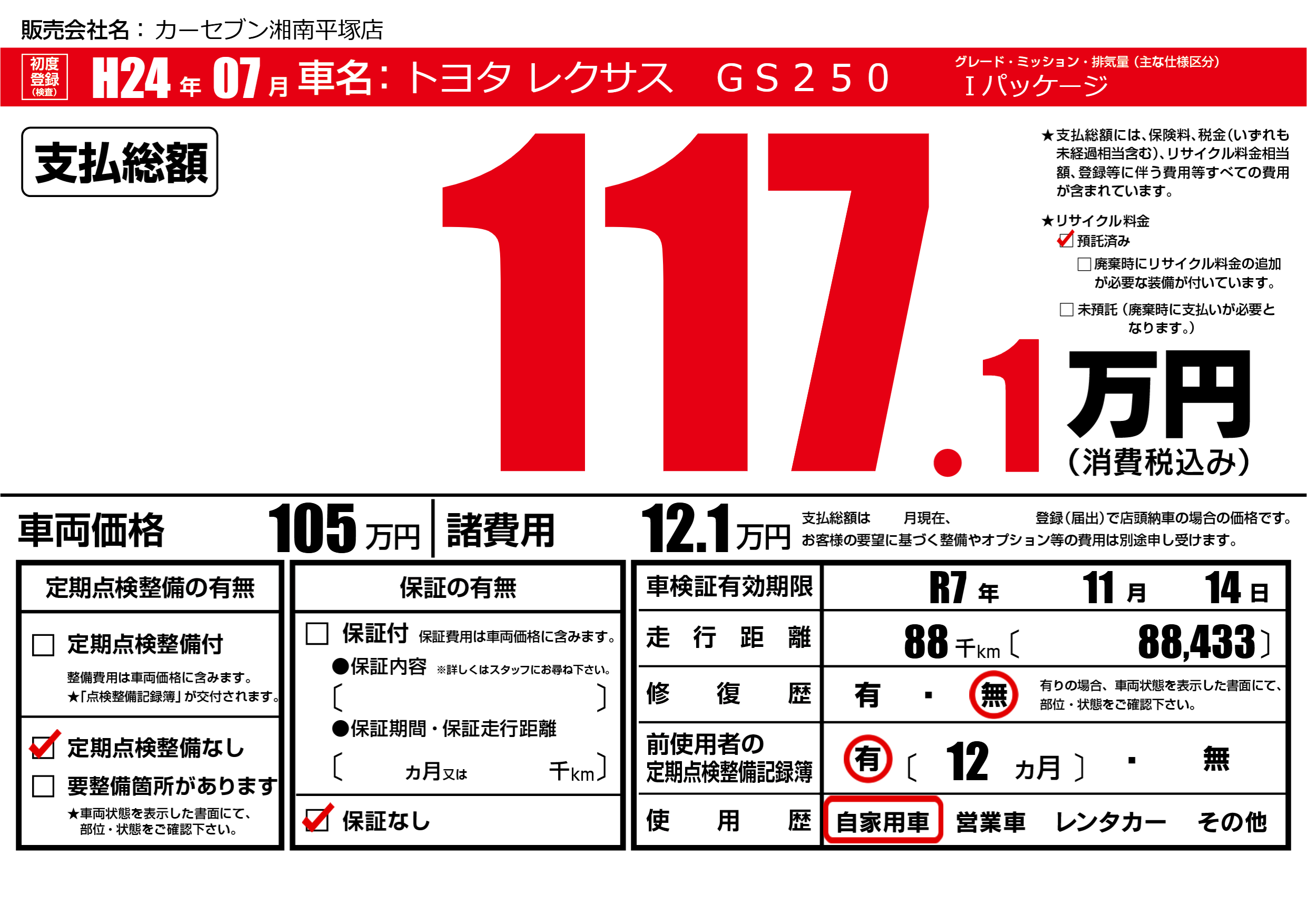 なし | 車検制限 | R7年11月14月 |