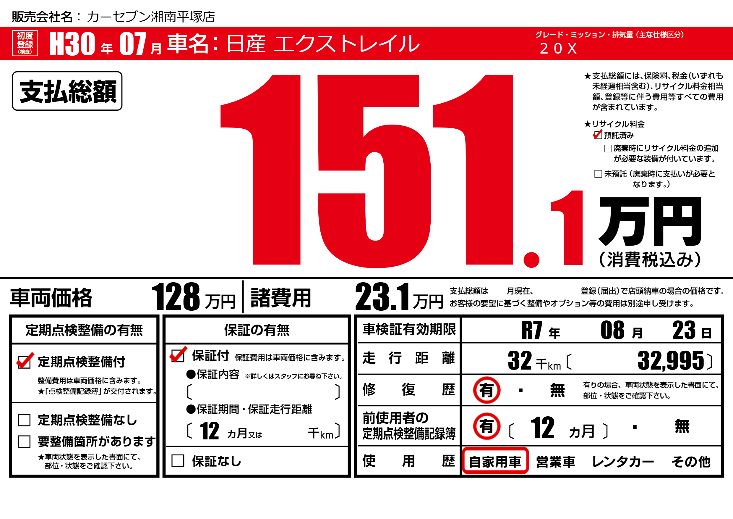 | 車名 | 日産 エクストレイル | グレード ミッション 排気量 |