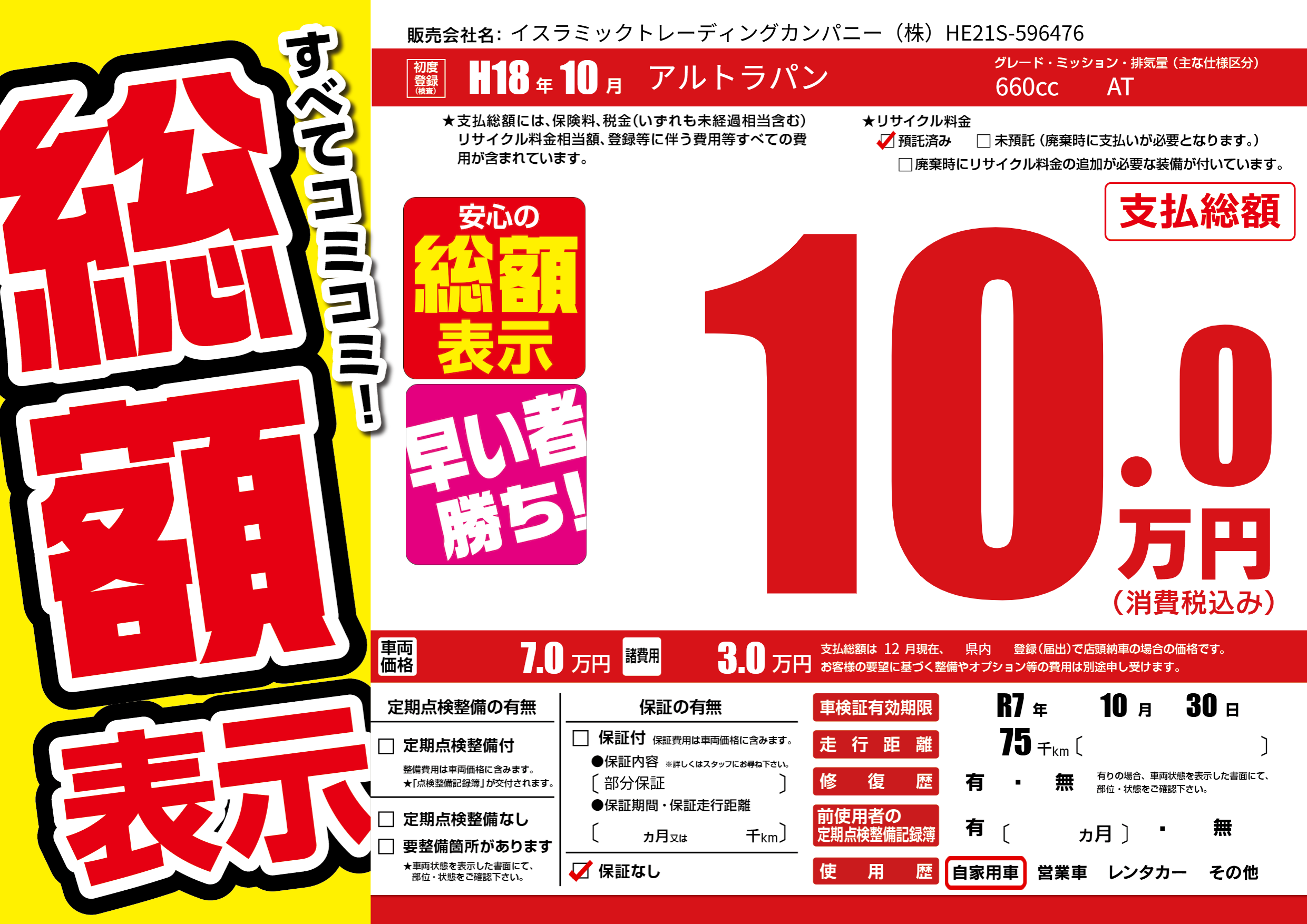 | 走行キロ | 7.5万km | 初年度登録 | H18年10月 |